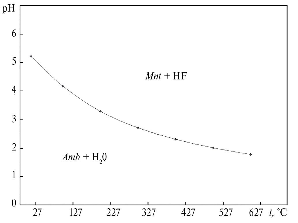 была рассчитана кривая равновесия минеральных фаз в условиях высокой кислотности минералообразующей среды (рис. 6). Как следует из диаграммы, при типичных температурах образования редкометальных литиевых гранитных пегматитов (400–600 °C) амблигонит образуется в условиях повышенной кислотности минералообразующей среды (pH < 3) при высокой активности HF, что соответствует его относительно редкой встречаемости в природе (Groat et al., 1990). В условиях не высокой кислотности (при значениях pH близких к нейтральным) с уменьшением активности HF устойчивым минералом становится монтебразит, что проявляется в образовании вторичного монтебразита по амблигониту (London, Burt, 1982; Baldwin et al., 2000).