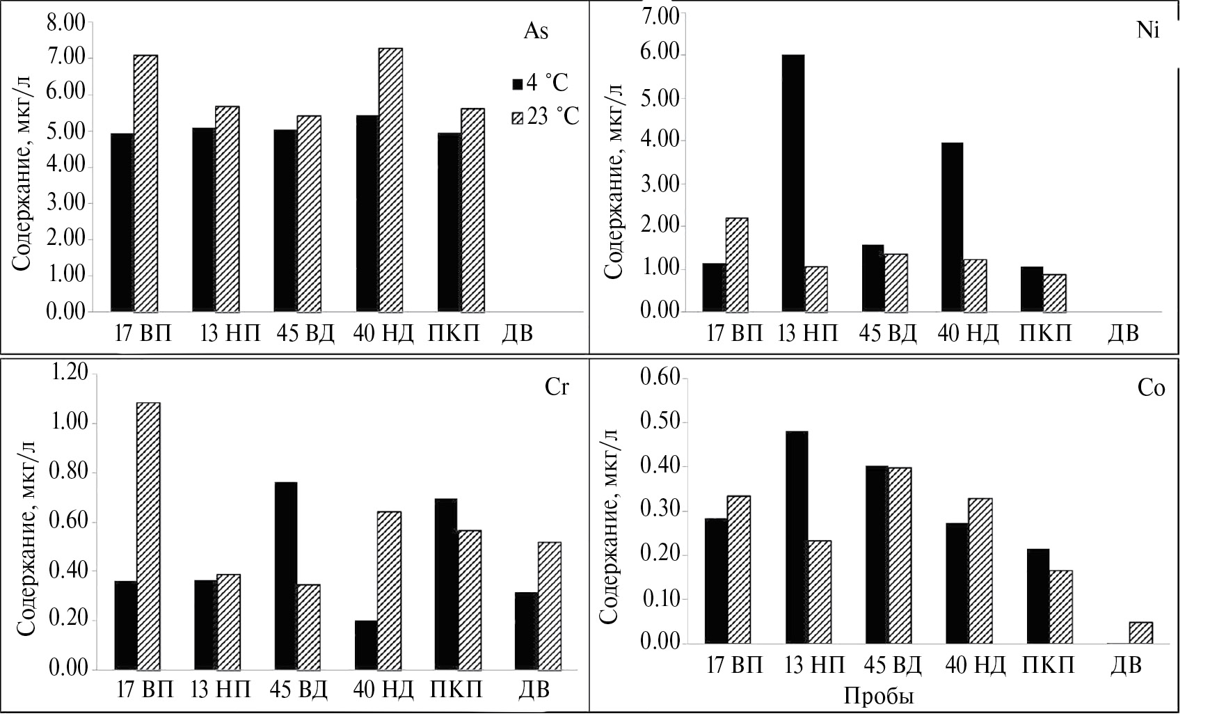 Рис. 2. Влияние температуры оттаивания (4 °C, 23 °C) и биогенного фактора на особенности выщелачивания элементов разного генезиса: As — халькофильный, Cr –литофильный, Ni и Cо — сидерофильные; Обозначения проб: см. рис. 1.