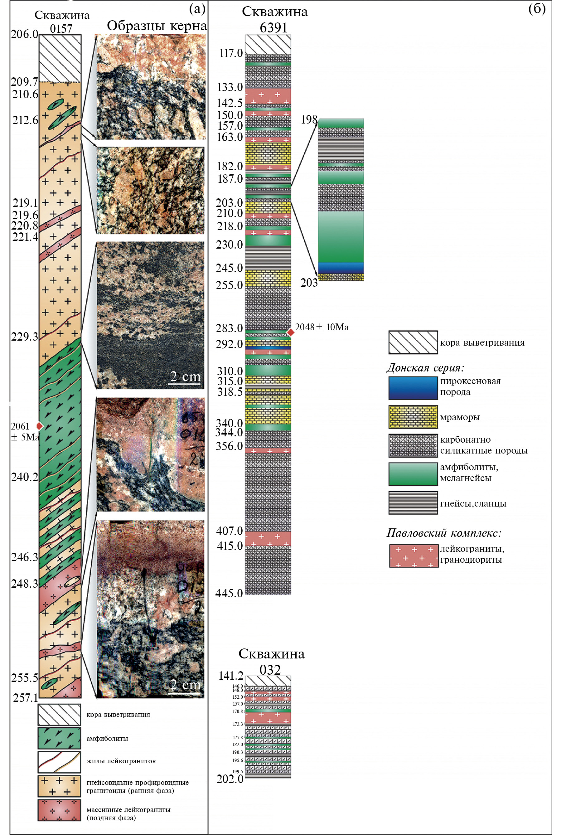 В данной работе исследованы породы донской серии минимально затронутые гранитизацией или мигматизацией (скважины 6391 (рис. 3б), 032, К-284). Также были изучены крупные ксенолиты амфиболитов и гнейсов среди средне-крупнозернистых гранитоидов павловского комплекса за пределами участка детализации (скважины 0157 (рис. 3а), 9056, 9061, К-270, К-247)