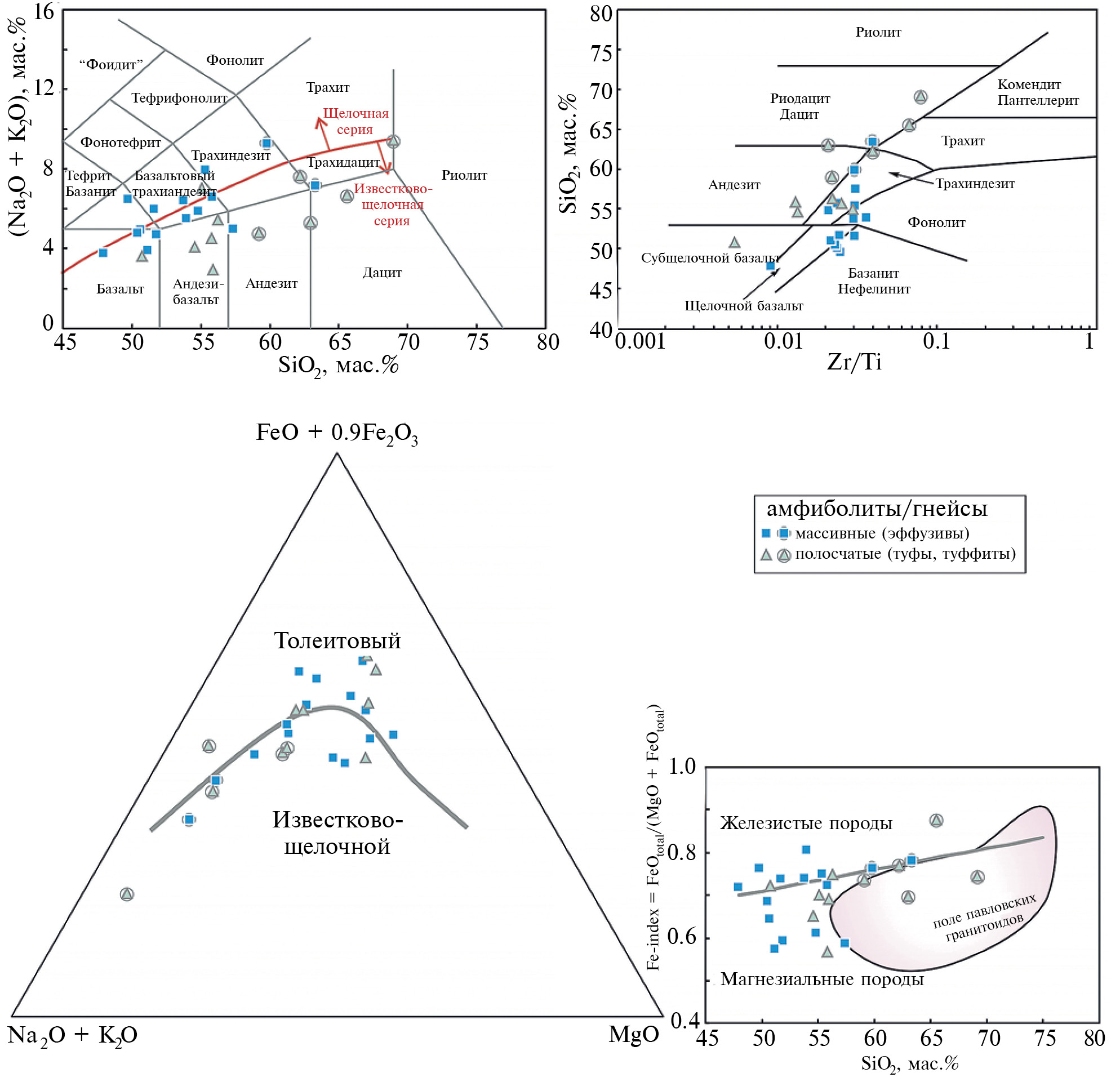 5. Fig. 4. Classification petrochemical diagrams for metavolcanic rocks of the Don series: SiO2–(Na2O + K2O) (LeBas et al., 1986), Zr/Ti–SiO2 (Winchester, Floyd, 1977), AFM (Irvine, Barragar, 1971) and SiO2–Fe-index (Frost, Frost, 2008).