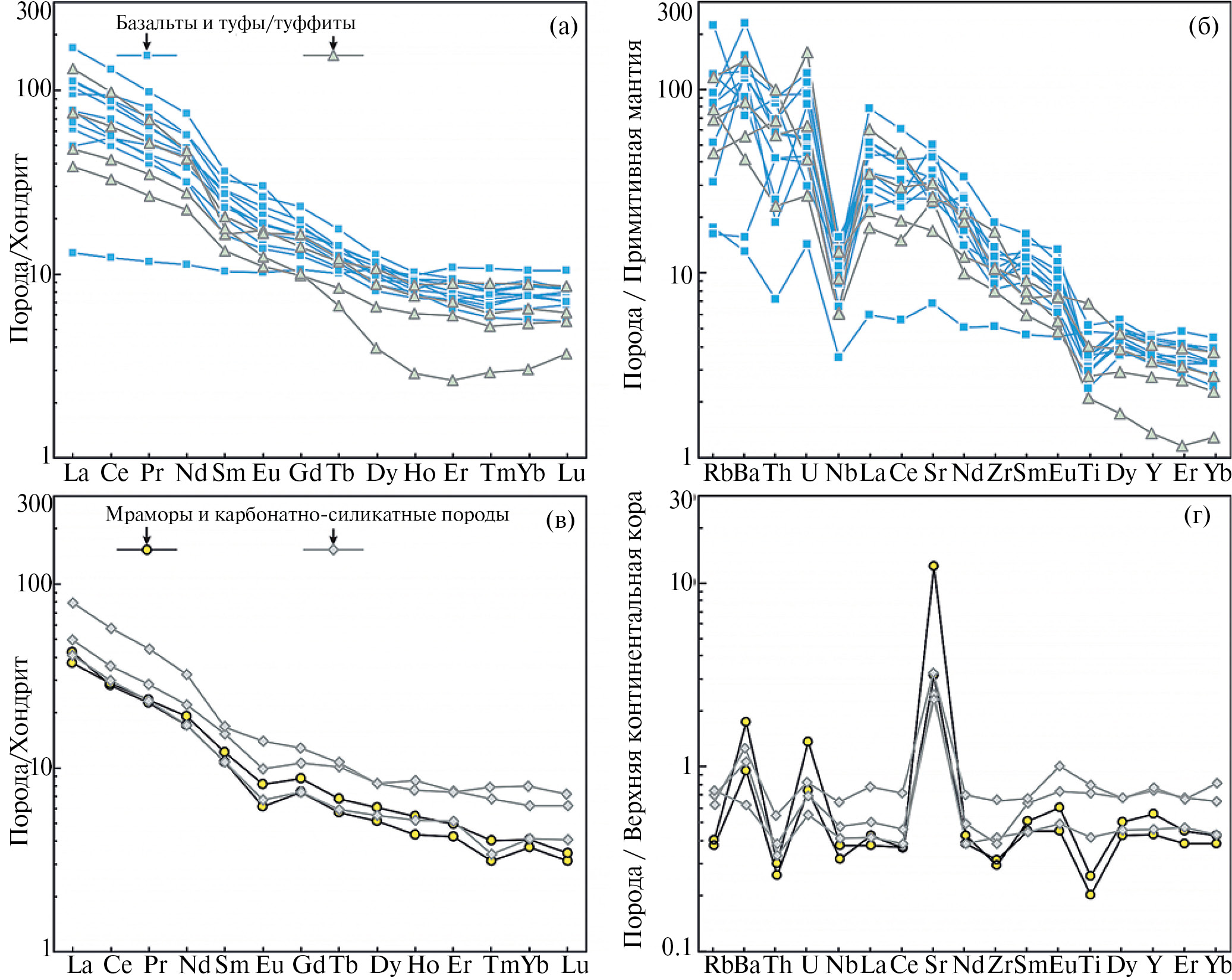 Мраморы и карбонатно-силикатные породы донской серии демонстрируют изменчивые концентрации главных элементов (табл. 1, рис. 6). Среди обогащенных карбонатом пород чистые мраморы отсутствуют, поэтому наряду с высокими содержаниями CaO (38–49 %) и потерь при прокаливании (18–28 %) в них обнаруживаются высокие концентрации кремнезема (до 31 %) и других оксидов: Al2O3 (3.3–4.5 %), Fe2O3 (1.8–7.6 %), MgO (0.6–2.6 %). Карбонатно-силикатные породы по сравнению с мраморами содержат меньше CaO (7.9–36.8 %) и потерь при прокаливании (1–17 %), более высокие концентрации кремнезема (до 57 %) и других оксидов: Al2O3 (3.9–14.2 %), Fe2O3 (5.1–13.3 %), MgO (до 4.8 %). По pаcпpеделению PЗЭ обе группы пород похожи (pиc. 5), они имеют сильно наклонные графики, отрицательные евpопиевые аномалии (Eu/Eu* = 0.67–0.96), что сближает их с палеопротерозойскими и неоархейскими граувакками (Condie, 1993). От PAAS мраморы и карбонатно-силикатные породы донской серии отличаются меньшей суммой РЗЭ. Отношение (La/Yb)N изменяется в интервале 8.0–11.6, сумма РЗЭ 57–75 ppm, что сопоставимо с суммой РЗЭ в верхней континентальной коре (ВКК). По содержаниям LILE и HFSE карбонатные породы близки к верхней континентальной коре (ВКК) (рис. 5), однако деплетированы Th и Ti в мраморах и обогащены Sr в обоих типах пород.