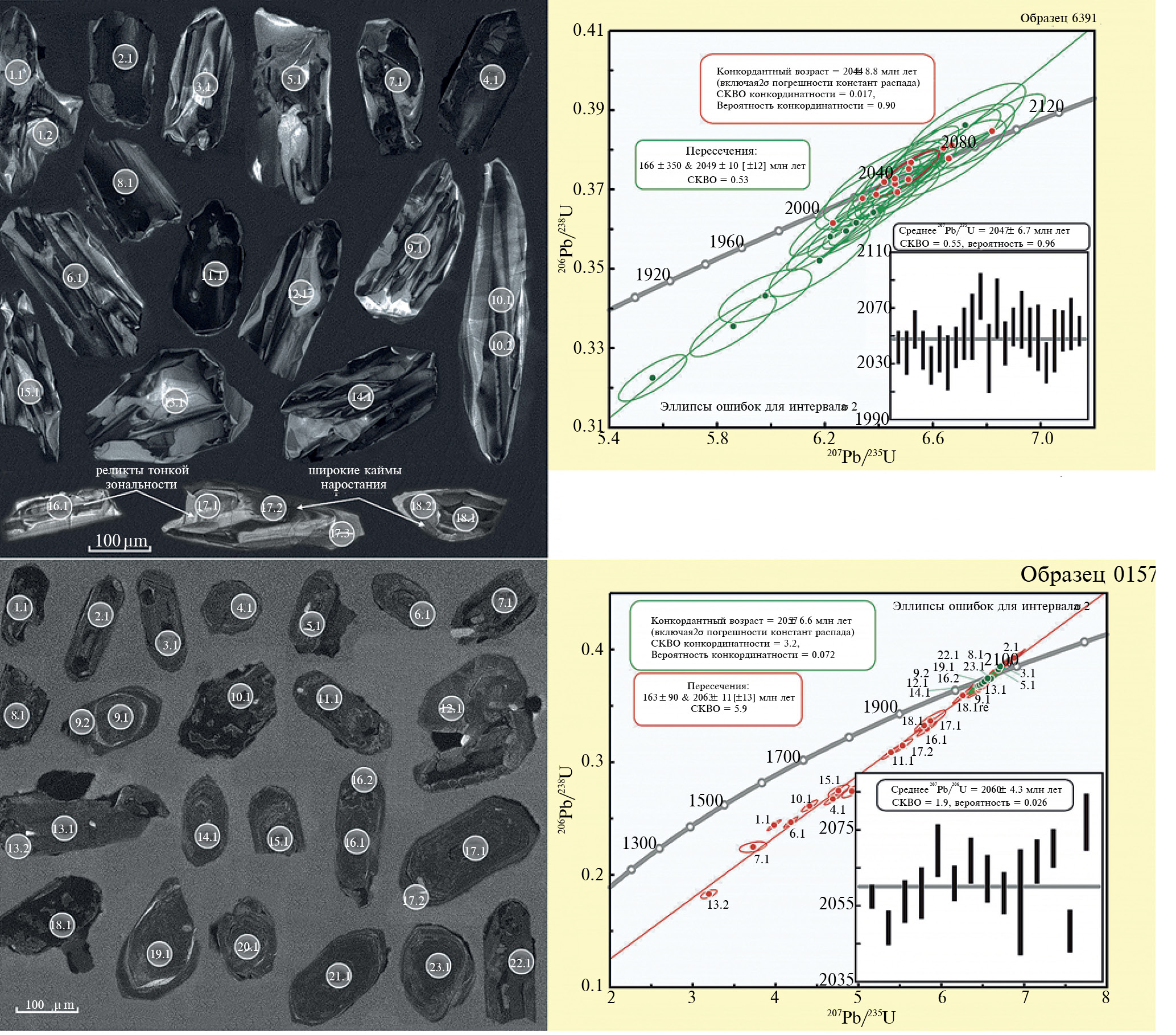 8. Fig. 7. Micrographs of zircon grains in the cathodoluminescence mode and diagrams with concordia for zircon from amphibolite and gneiss of the Don series (samples 0157/231-243 and 6391/282-288). The numbers of measurement sites correspond to the measurement results in Table 2.