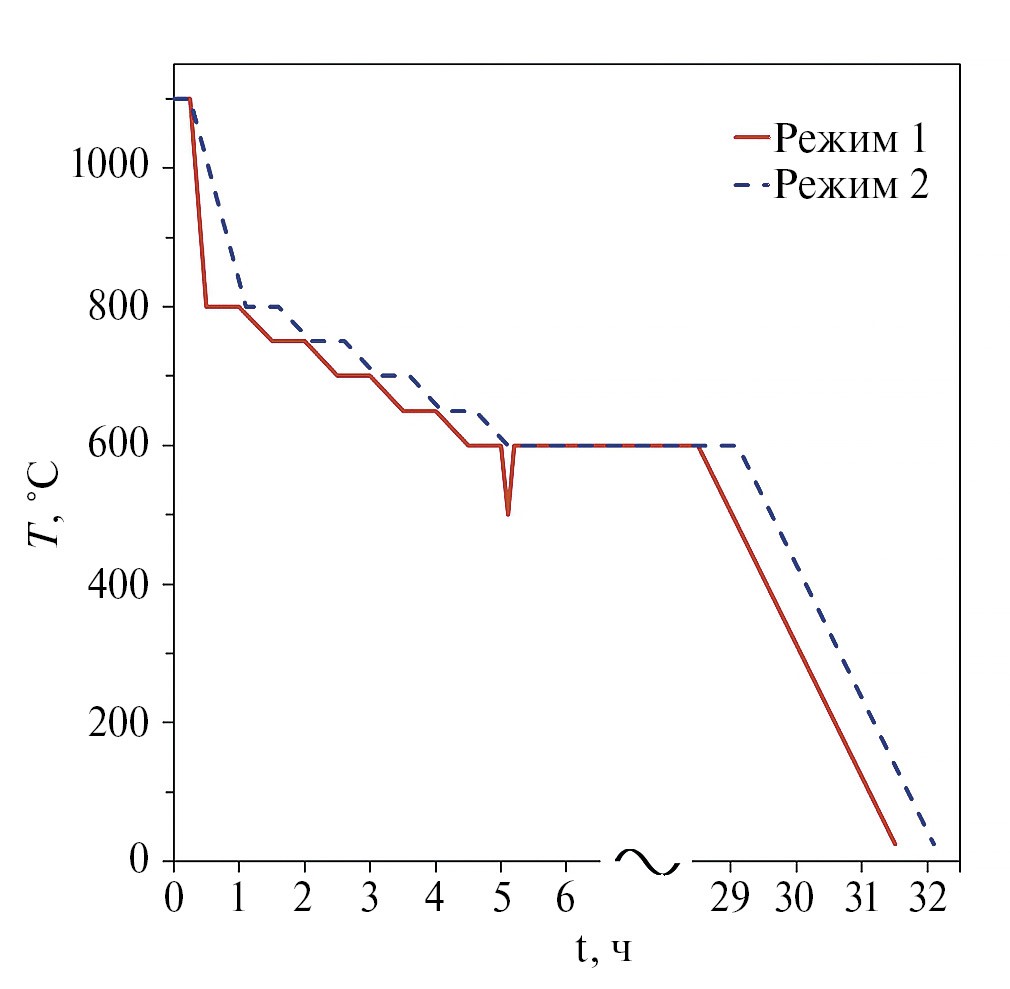 С целью получения стеклокерамических образцов использовался петрургический метод в двух режимах (рис. 1). Для этого измельченные образцы стекол 1Na3Cs50 и 2Na2Cs50 помещались в кварцевые тигли, выдерживались при 1100 °C в муфельной печи и постепенно охлаждались до 600 °C. Согласно режиму № 1, обозначенному на схеме красным цветом, образцы однократно подвергались резкому охлаждению до 500 °C для замедления процесса нуклеации с последующим нагревом до 600 °C и выдержкой в течение 24 часов при заданной температуре с целью кристаллизации по всему объему. После чего образцы самопроизвольно остывали в печи до комнатной температуры. Режим отжига № 2, обозначенный на схеме синим цветом, отличается от № 1 меньшей скоростью изменения температуры на первом этапе и отсутствием кратковременного охлаждения до 500 °C.