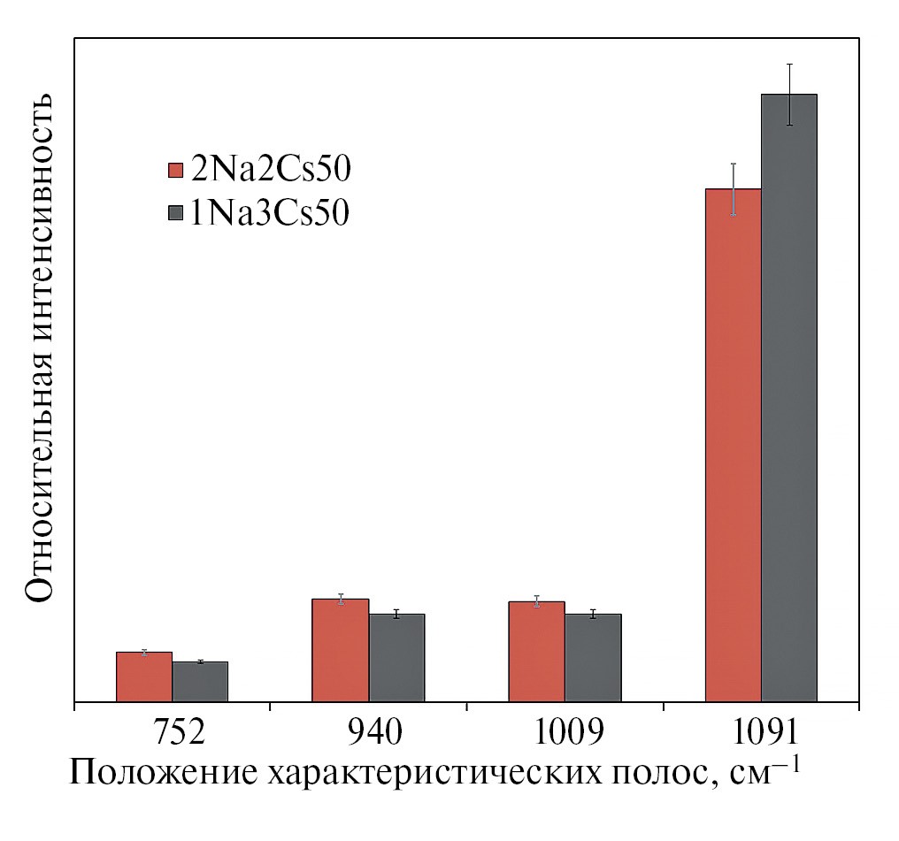 Из результатов проведенного разложения спектров комбинационного рассеяния (рис. 3б) можно заметить, что замещение натрия на цезий в составе боросиликатного стекла практически не влияет на количество и положение основных полос. Однако, изменение состава стекла приводит к заметным вариациям интенсивностей линий, что говорит об изменениях структуры. Можно отметить три основных отличия спектров стекол 1Na3Cs50 и 2Na2Cs50, обусловленных следующими значимыми изменениями в структуре. Во-первых, при увеличении содержания цезия в составе стекла происходит уменьшение количества Q2-единиц, что подтверждается отношениями интенсивностей линий с максимумами 940 и 1009 см–1, равными 0.87 и 0.89 соответственно. Отношение интенсивностей линии с максимумом 1091 см–1 в спектрах КР образцов до и после кристаллизации равно 1.20, из чего можно сделать вывод об увеличении содержания Q3-единиц. Это подтверждается увеличением количества мостиковых связей Si-O-Si, характерная полоса для которых появляется в области 594 см–1 на спектре комбинационного рассеяния стекла 1Na3Cs50. Во-вторых, наблюдается уменьшение доли четырехкоординированного бора [4]B в составе различных надструктурных боратных группировок (752–754 см–1). И в-третьих, при увеличении содержания цезия в составе стекла наблюдается уменьшение интенсивности высокочастотной полосы около 1463 см–1, которое связано с уменьшением количества боратных треугольников BO3 в системе. Для наглядности интенсивности основных полос приведены на рис. 4 в виде диаграммы.