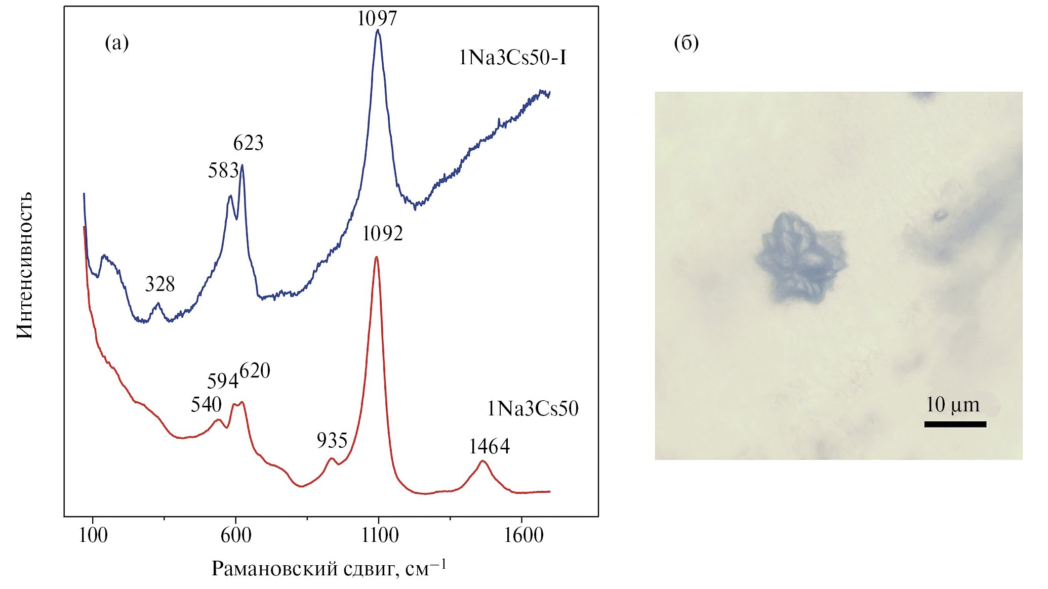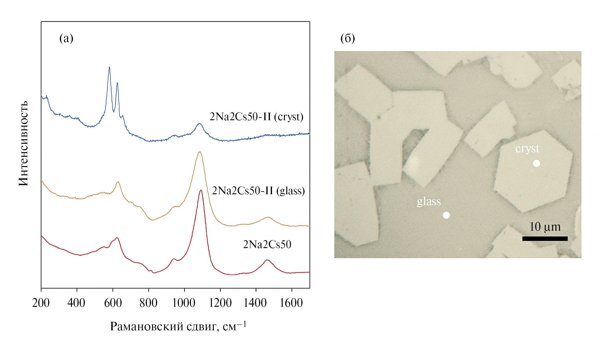 В результате синтеза стеклокерамики из расплавов двух исследуемых составов обнаружена их частичная кристаллизация, при этом объем кристаллической фазы значительно зависит от режима термической обработки и меньше – от количественного соотношения щелочных катионов. На рис. 5 и 6 приведены изображения кристаллов, обнаруженных в стеклокерамических образцах 1Na3Cs50-I и 2Na2Cs50-I соответственно, полученных согласно схеме № 1. Также на рисунках представлены спектры комбинационного рассеяния кристаллов в сопоставлении со спектрами исходных стекол. Из результатов химического анализа по данным СЭМ были определены составы полученных кристаллов в образцах 1Na3Cs50-I и 2Na2Cs50-I. Они соответствуют химической формуле боросиликата CsBSi2O6 (Koroleva et al., 2023). Кристаллическая структура полученного в обоих образцах боросиликата цезия не была определена однозначно, поскольку не удалось найти дифракционного соответствия с какими-либо фазами. Тем не менее, химический состав образованных упорядоченных фаз однозначно свидетельствует в пользу включения в них цезия.