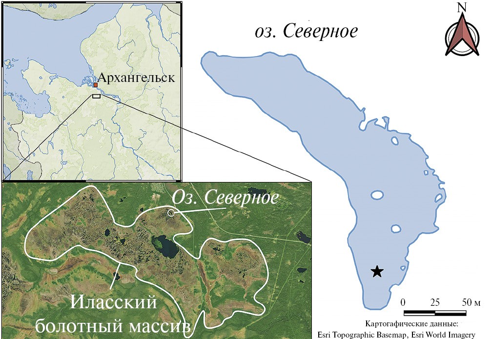 Рис. 1. Карта-схема озера Северное. Местоположение точки отбора проб отмечено звездой.