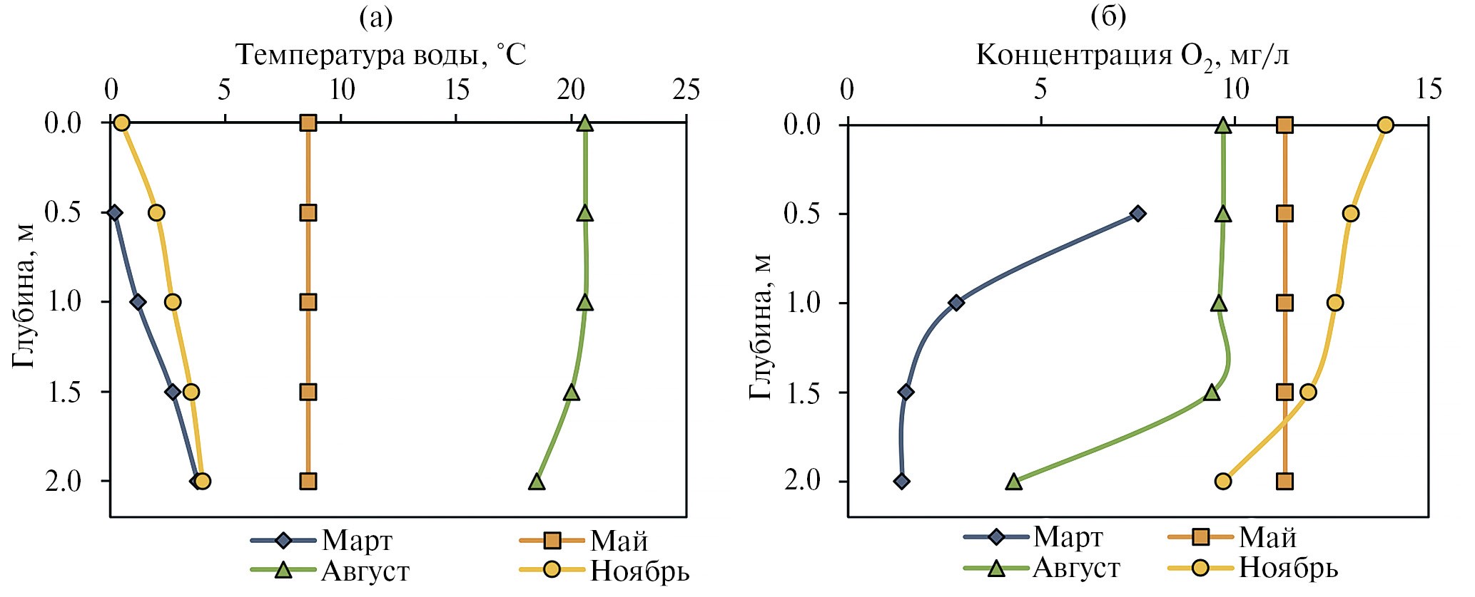В марте отмечалась резкая обратная температурная стратификация вод до дна (рис. 2а). Температура росла от 0.2 °C в подледном горизонте, до 3.8 °C в придонном. Вода была слабо насыщена кислородом: его концентрация в подледном горизонте составляла 8.8 мг/л, насыщенность 61 %. С глубиной концентрация кислорода снижалась до 1 мг/л в придонном горизонте; оксиклин находился на глубине ~ 1 м (рис. 2б).
