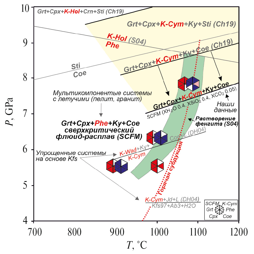 Рис. 1. Р-Т-условия экспериментов, фазовый состав полученных образцов и имеющиеся данные об условиях образования калийсодержащих фаз высокого давления — потенциальных минералов концентраторов LILE, воды и азота в упрощенных водосодержащих системах на основе калиевого полевого шпата, а также мультикомпонентных пелитовых и гранитных системах. Шестиугольники с красными секторами показывают фазовый состав образцов со сланцем, шестиугольники с синими секторами — с пелитом (закрашенный и не закрашенный цветом сектора означают присутствие и отсутствие фазы, соответственно). В шестиугольнике с синими секторами, окрашенный розовым сектор означает присутствие лишь единичных зерен фенгита. DH04 — Harlow and Davies, (2004); S04 — Schmidt et al. (2004); Ch19 — Chapman et al. (2019). Граница стабильности K-кимрита (K-Cym) в пелитовой системе приведена по нашим данным. Обозначения основных фаз приведены в табл. 2. K-Wad — калиевый вадеит, K-Hol — калиевый холландит, Sti — стишовит, Crn — корунд. Состав сверхкритического флюида-расплава (SCFM), в присутствии которого образуется K-кимрит в пелитовой системе, оценен на основании данных работы (Sokol et al., 2023b)