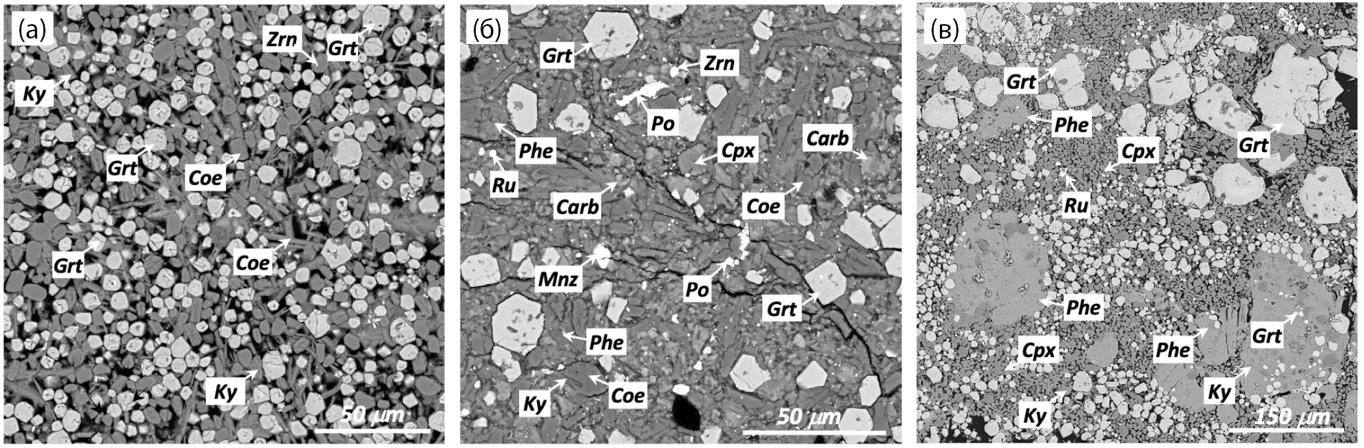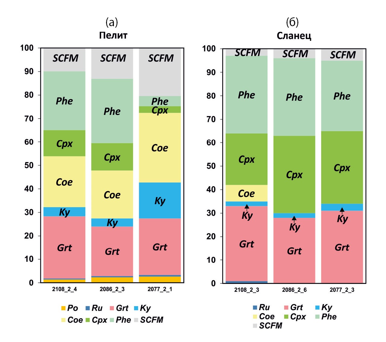 Полученные ранее (Сокол и др., 2023а,б; Sokol et al., 2023; Kupriyanov et al., 2023) и новые данные свидетельствуют о том, что богатый летучими пелит при давлении в диапазоне от 5.5 до 7.8 ГПа и температуре от 900 до 1090°С превращается в ассоциацию граната, клинопироксена, ± фенгита, коэсита и кианита. Он содержит акцессорные пирротин, рутил, циркон (рис. 2а) и до 20 мас. % сверхкритического флюида-расплава. Продукты закалки последнего во всех случаях фиксируются в межзерновом пространстве образцов в виде пустот, содержащих игольчатые и дендритные кристаллы коэсита и кианита (рис. 2а). Для характеризации фазовых отношений в образцах пелита и сланца нами выполнены расчеты баланса масс. В них использованы данные о составах минералов в ассоциациях, полученных в этой работе (рис. 3), а также информация о составе сверхкритического флюида-расплава в пелитовых системах (Hermann et al., 2013; Sokol et al., 2023b).