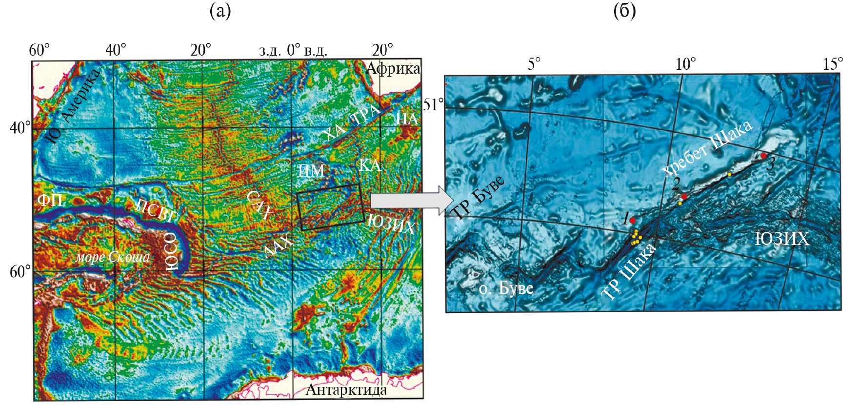 (б) Батиметрия района хребта Шака (Summary of recommendations…, 2019 с дополнениями). Красными точками показаны номера станций драгирования 2016 г. Желтыми точками показаны пункты драгирования Океанографического института Вудс-Хола, выполненные в 1982 (в южной части ТР Шака) и 2001 гг. (в центральной части хребта Шака). ТР – трансформный разлом, ЮЗИХ – Юго-Западный Индийский хребет