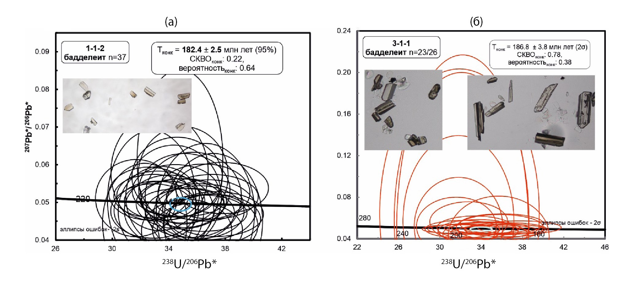 Рис. 4. Уран-свинцовые диаграммы с конкордией в координатах Тера-Вассербурга для измеренных единичных зерен бадделеита из образцов долерита со станций драгирования на хребте Шака: а – станция 1, образец FB-1–1-2; б — станция 3, образец FB-3–1-1. Поправка на долю обычного (нерадиогенного) свинца введена по измеренному содержанию 208 изотопа (208Pb-метод). На врезках показаны изученные зерна бадделеита, оптическое изображение в проходящем свете. 206Pb* — доля радиогенного Pb (см. текст)