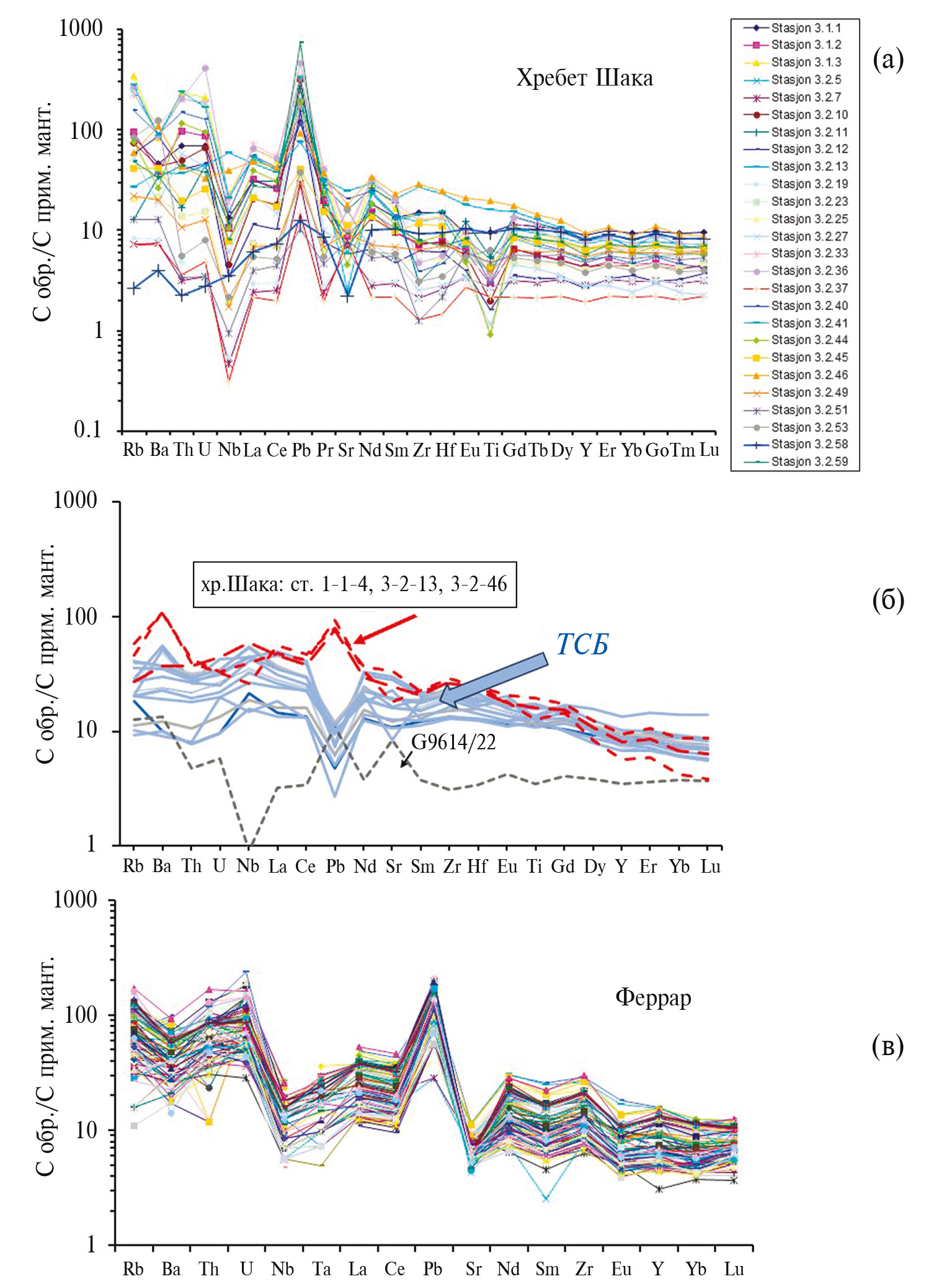 По химическому составу изученные магматические породы всех трех станций пробоотбора близки между собой и обладают специфическими характеристиками нормированного распределения литофильных элементов: отрицательной Nb–Ta аномалией и положительными Ba и Pb, и существенно отличаются от типичных составов базальтов океанических островов (OIB), включая и толеитовые базальты района ТСБ. По характеру обогащения литофильными элементами наиболее близкими к изученным базальтам хребта Шака являются базальты провинции Феррар и Фолклендских островов.