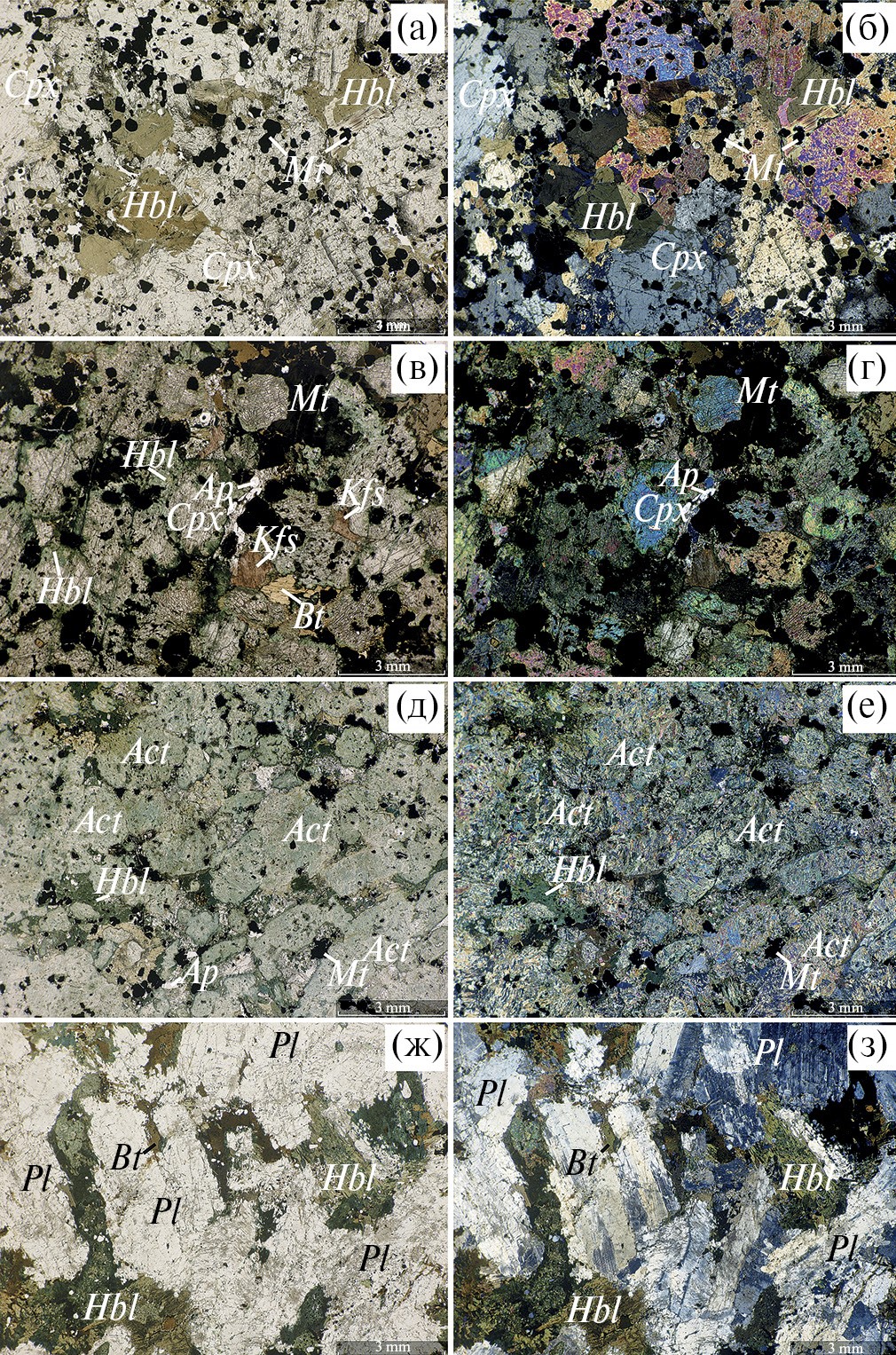 (а–е): пироксениты первой фазы внедрения с разной степенью метаморфических преобразований: неизмененные – образец Б-22-537-1 (а, б), слабоизмененные – образец Б-22-550 (в, г), сильноизмененные – образец Б-22-552 (д, е); (ж, з): диориты второй фазы внедрения – образец Б-22-541. Изображения сделаны при параллельных (а, в, д, ж,) и скрещенных (б, г, е, з) николях. Здесь и далее аббревиатуры минералов приведены по (Whitney, Evans, 2010).