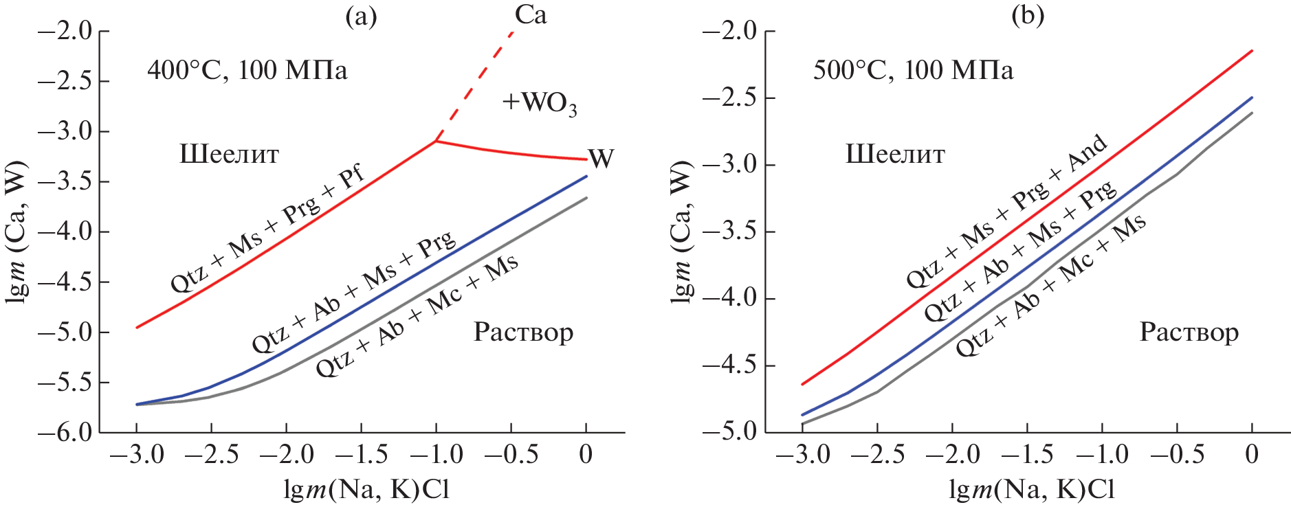 Experimental studies were carried out on the solubility of scheelite in HCl solutions in the concentration range from 0.01 to 0.316 mol•kg-1 H2O at 400 and 500°C, a pressure of 100 MPa and the fugacity of oxygen (hydrogen) specified by the buffers Cu2O-CuO, Fe3O4-Fe2O3, Ni-NiO and Co-CoO. It was found that scheelite in HCl solutions at the specified parameters dissolves incongruently. In solutions containing from 0.01 to 0.0316 m HCl, minor amounts of tungsten oxides WO3 and (or) WO3-x are found in the run products, along with scheelite. In solutions containing from 0.1 to 0.316 m HCl, the formation of calcium tungsten bronzes (CTB) CaxWO3 is observed, the average composition of which corresponds to the formula Ca0.07WO3. Based on the analysis of the experimental data obtained, the free energies of the formation of tungsten oxides WO3, WO2.9, scheelite and calcium of tungsten bronze were calculated. Using mutually agreed thermodynamic data, the solubility of Sch in solutions of HCl, (Na,K)Cl with the participation of alumino-silicates is calculated. It is shown that the scheelite has a wide area of congruent solubility in saline systems.