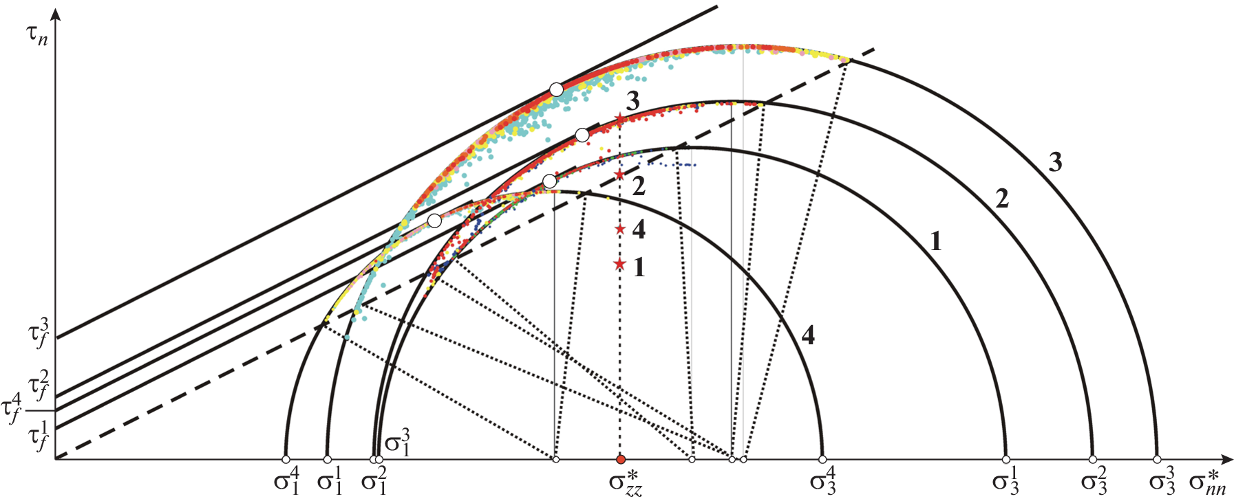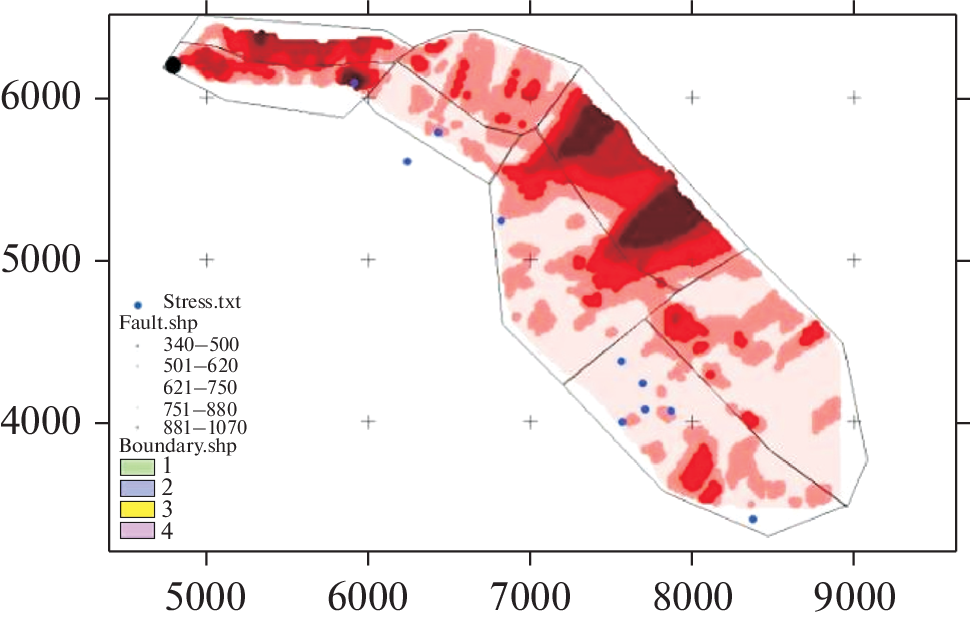 A new technology of stress inversions is proposed on the basis of data of mute fracturing with measured amplitudes of dilative opening of fractures (tension shear), which are registered by mineralization (vein bodies). The involvement of a basic law of geomechanics of supercritical deformation, which determines the interrelation between amplitudes of shear deformations and deformations of transverse extension (dilatancy), allows us to link the amplitudes of opening of shear fractures with the level of Coulomb stresses. This approach can be used for a conjugated fracture system and fault zones with a system of similarly oriented fractures. Our algorithm and technology of stress calculation consist of consecutive analysis of a geometrical form and characteristic lineaments of density zone of fracture poles on the stereospheres and stress conditions of these fractures on Mohr’s diagram. The algorithm allows the calculation of the parameters of stress tensor both on the basis of graphical analysis on the stereonets and Mohr’s diagram and using a group of formulas. The algorithm is applied for the Nadvigovaya zone of the Badran deposit. The stress values are calculated for a fault area with measured fracturing, and a forecast for promising areas is given for a deeper fault part in areas with possible most intense dilatancy of fracture flow.