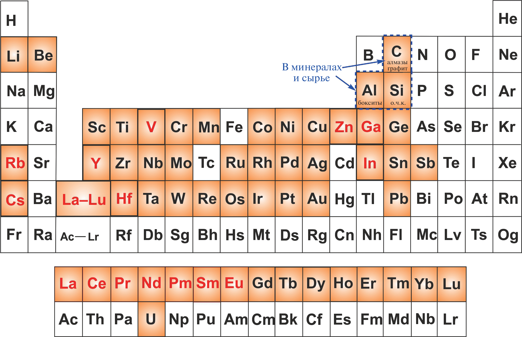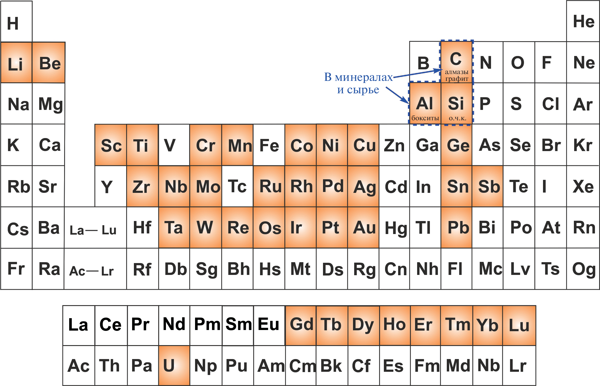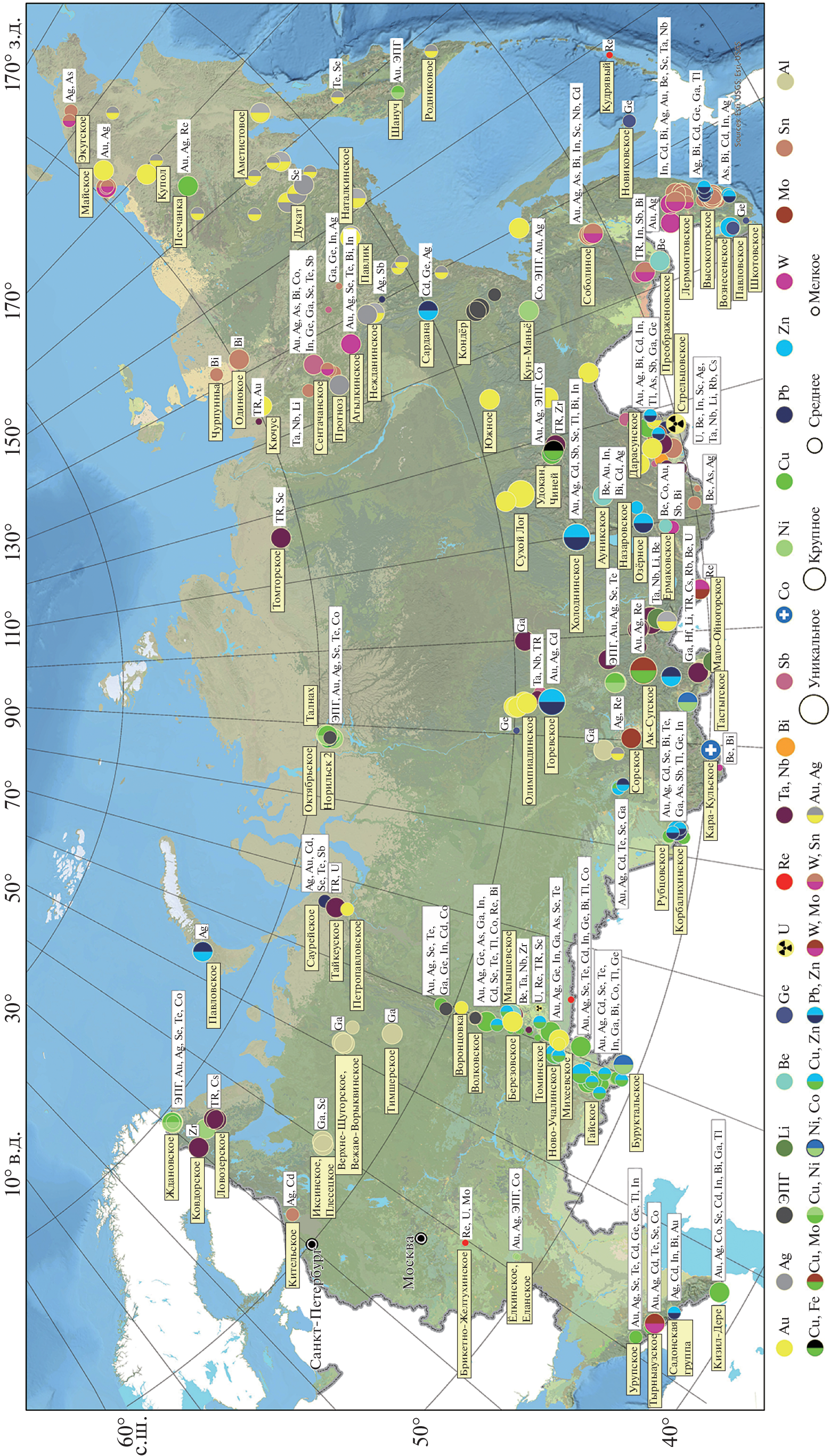 raw materials (MRMs)—the necessary basis for the production of high-tech products. The advanced producing countries of these products are in dire need of various raw materials, which are critical and, as a rule, are supplied from third countries. Strategic is a mineral raw material, which is of particular importance for ensuring the economic development of the country, its defense and security. Due to the complex structure of extraction, processing and consumption of raw materials, many of its types are in short supply. In the world literature, the concept of “deficient MRMs” in its content most closely corresponds to “critical MRMs,” that is, raw materials that are critically needed for industry and are characterized by a significant risk of their supplies. Most critical raw materials are needed for production promising high-tech industrial products and new materials and, in particular, for “green technologies” in connection with the course of decarbonization of the economy actively pursued by world powers. In the production of such products, the consumption of MRMs is growing rapidly, especially rare-earth elements (REEs), V, Li and platinum-group elements (PGEs). From the list of 61 kinds of MRMs that are strategic for Russia, the extraction of oil, gas, Cu, Au, PGEs, Ni, apatite ores, K salts, and diamonds (as well as nonlisted coals, Fe ores, Na salts, V, B ores, magnesite, and chrysotile asbestos) fully covers their current domestic consumption in the Russian Federation and the achieved level of export. U, Mn, and Cr ores; Zr; high-purity quartz raw materials (SiO2); bauxite (Al); graphite; fluorite and nonstrategic barite; kaolin; and bentonite are deficient; their exploitation only partially provides domestic consumption, which is largely dependent on imports; it is carried out in insufficient volumes in the presence of significant reserves of relatively low quality. The most deficient in this list are Ti, Li, Ta, Nb, and REEs (usually, there are groups of heavy and light rare earths (HREEs and LREEs, respectively)): their domestic consumption is provided mainly by imports with very limited production (despite large reserves, including low quality ores). Re, Be, Nb, Ta, HREEs, Y, Sc, LREEs, Ge, Ga, Li, Hf, and Co, and, of nonstrategic MRMs, Bi and Sr, should be considered critical MRMs in the Russian Federation. The most important source of dispersed/ associated elements is represented by raw materials of mining enterprises of nonferrous metallurgy: Cu and Zn subsectors, In, Ge, Ga, Cd, Tl, Se, Te, Sb, Bi, etc.; Al subsectors, Ga; for Au and Au–Ag deposits, Sb, As, Te, Se, Bi, Tl. An associated source of lithium is represented by brines of gas-condensate fields. The issues of assessing complex raw materials for high-tech industry are considered using the example of pyrite, porphyry, and gold-ore deposits of the Ural folded region, which play an important role in its overall metallogenic potential.