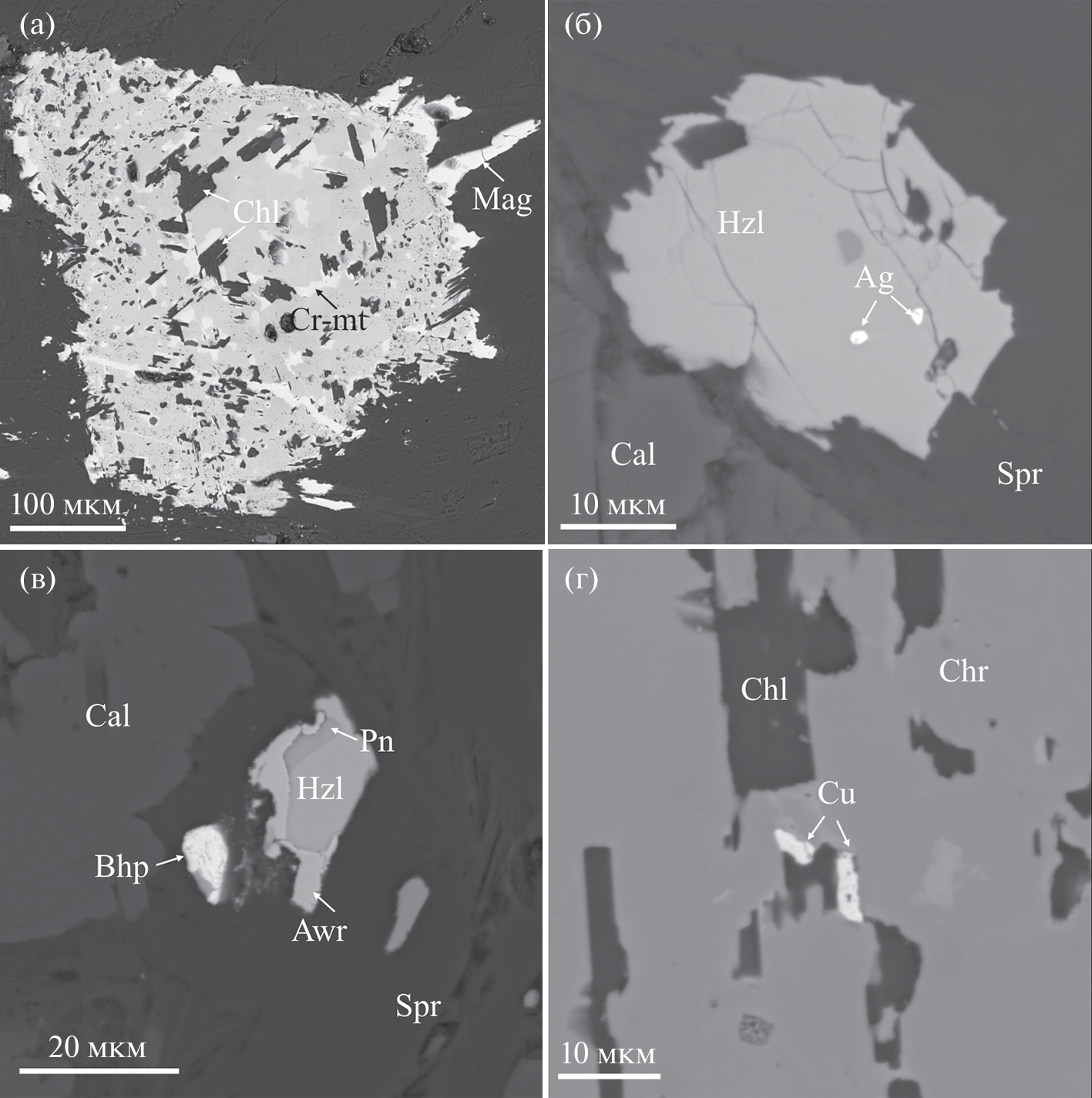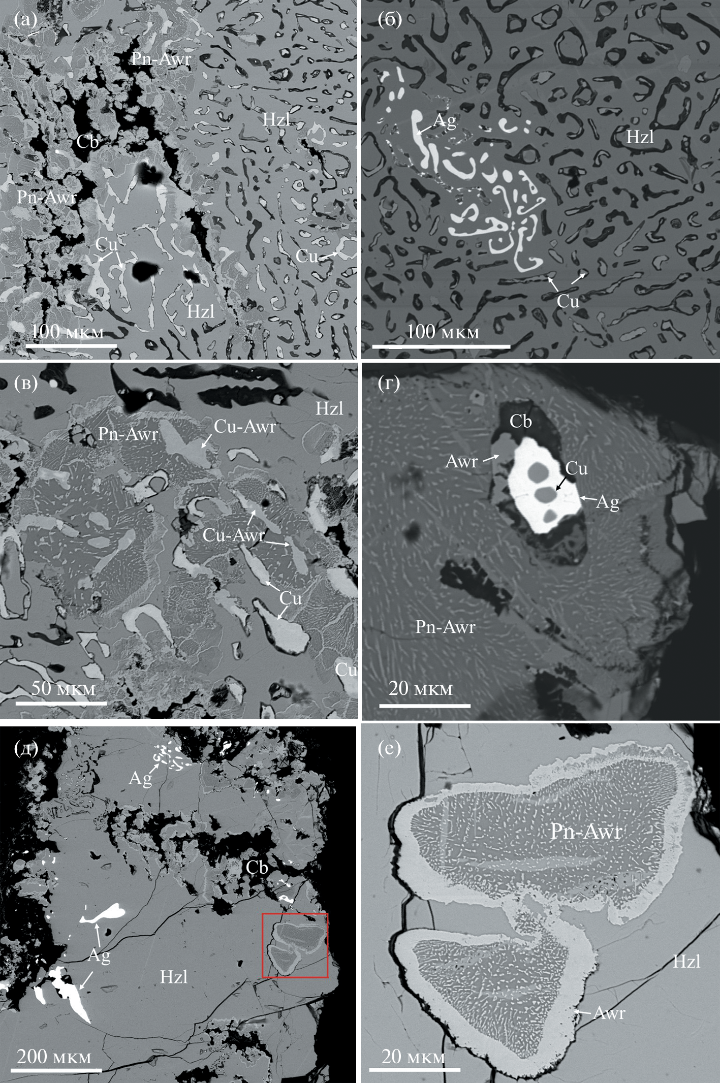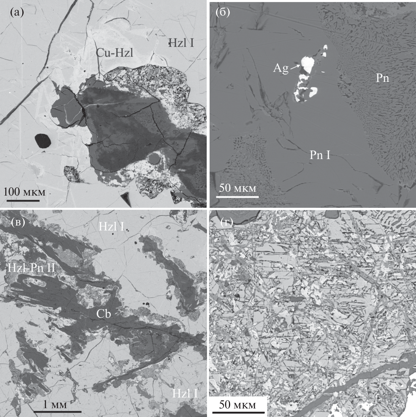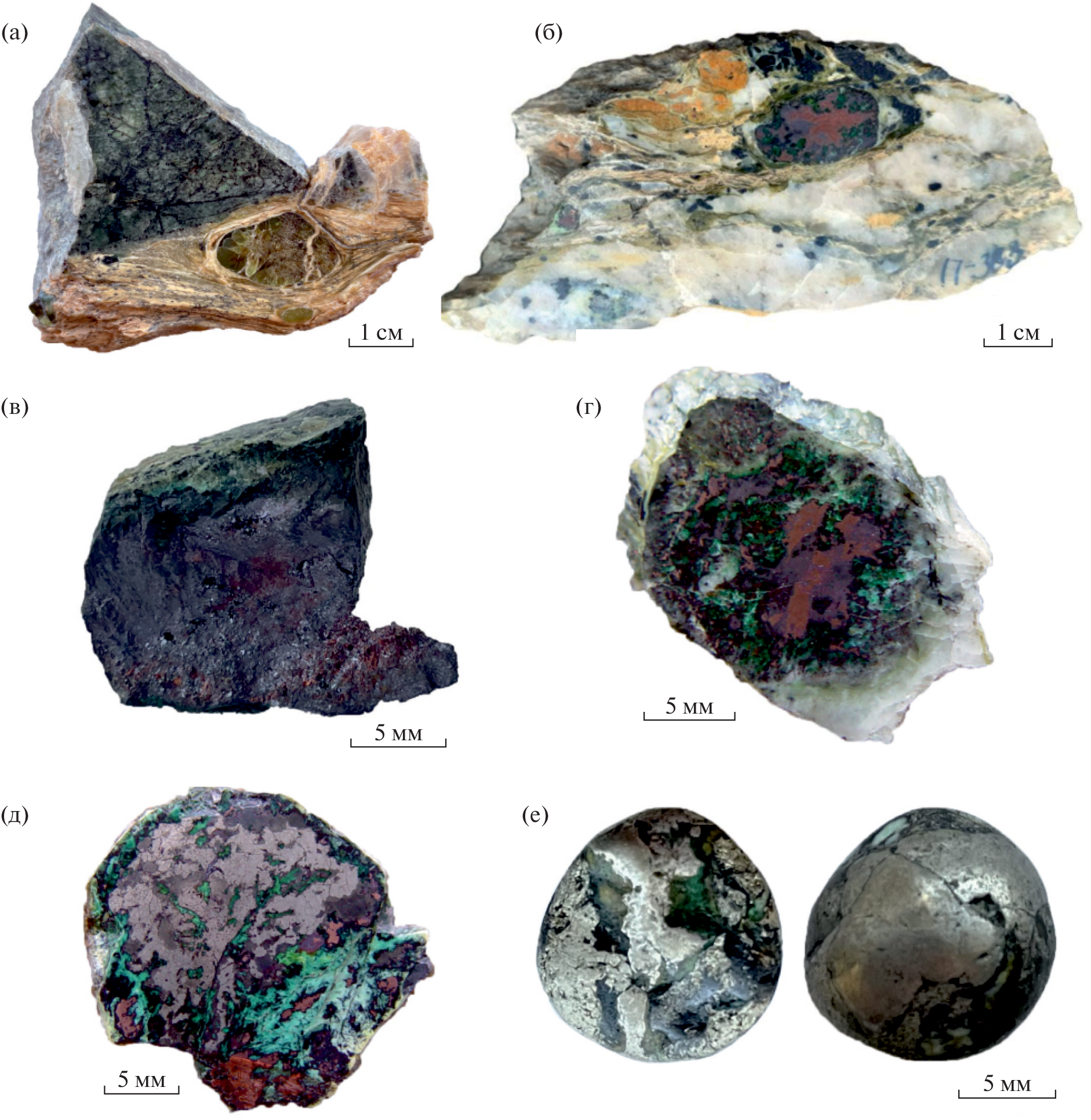 Описаны полиминеральные агрегаты округлых форм (“желваки”), сложенные самородными и сульфидными минералами Cu, Ni, Fe, Ag и других элементов из жильных магнетит-кальцит-хризотиловых пород с ювелирным демантоидом в Коркодинском гипербазитовом массиве. Общей чертой шести выделенных типов самородно-сульфидных желваков, сложенных самородной медью, хизлевудитом, пентландитом, купритом и другими сульфидно-самородными минералами, является сфероидальная форма, что сближает их с отдельными зернами других минералов жильной массы (кальцит, магнетит и др.). В хизлевудит-пентландитовых желваках обнаружены специфические симплектиты ртутистого серебра и никелистой меди в хизлевудите, а также аваруита – в Со-пентландите. Совпадающий набор рудных минералов во вмещающем жильную массу серпентините (самородные медь, ртутистое серебро, хизлевудит, пентландит, аваруит) и желваках из жильного материала свидетельствует об их генетической связи и сопряженности демантоидной минерализации с эволюционирующими процессами серпентинизации.