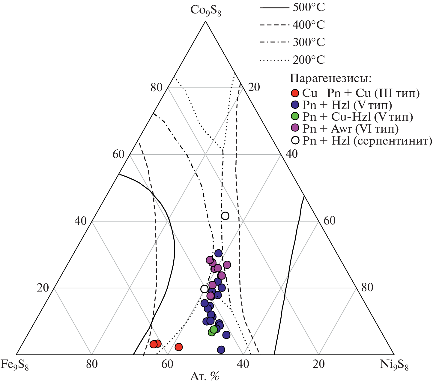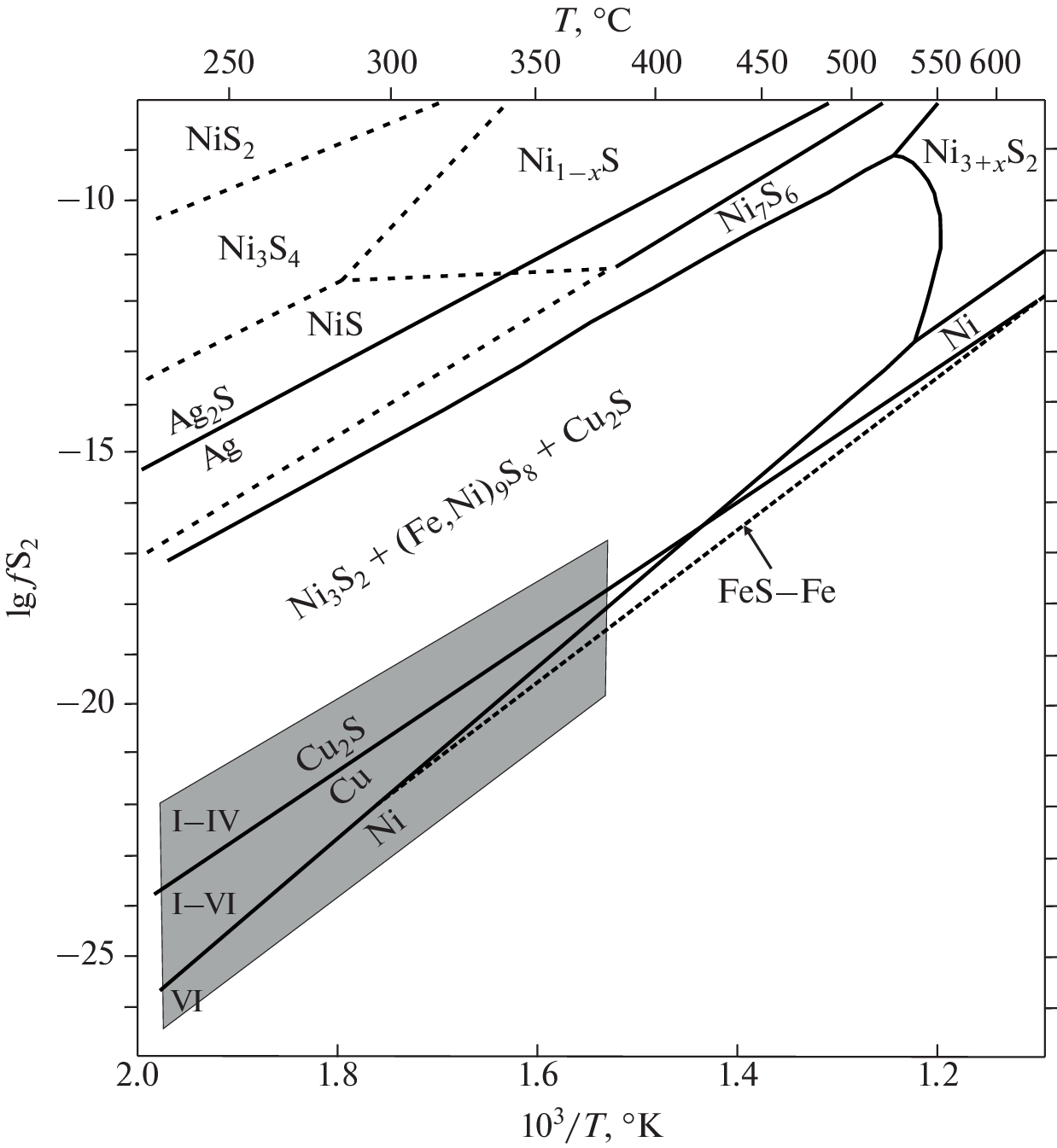 Установлено, что желваки образовались при температуре ниже 380°C в восстановительных условиях при очень низких значениях фугитивности серы (10–17–10–27 бар) и кислорода (10–30 бар при 200°С – 10–21 бар при 350°С). Для хизлевудит-пентландитовых желваков такие условия сохранялись в течение всего времени их формирования, в то время как для других желваков восстановительные условия ранних парагенезисов сменялись окислительными в поздних парагенезисах, что фиксируется замещением самородной меди купритом.