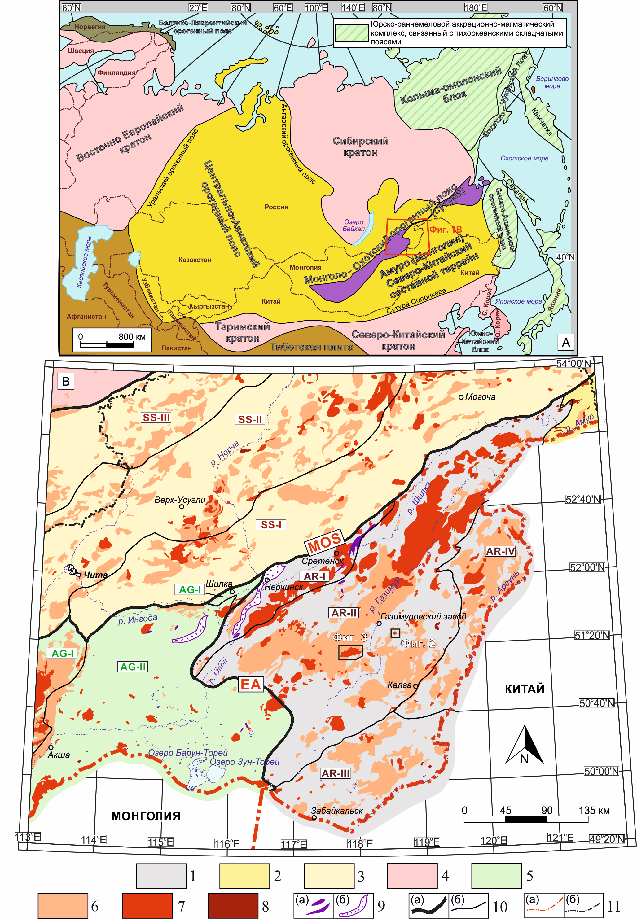 Фиг. 1. (A) Положение Монголо-Охотского орогенного пояса на упрощенной тектонической схеме Азии (по (Jahn et al., 2009) и (Zhang et al., 2019)). (Б) Распространение пермо-триасовых, юрских и меловых гранитоидных интрузий на упрощенной тектонической схеме Восточного Забайкалья (Nevolko et al., 2021): 1 — Аргунский террейн: AR-I — Борщовочный, AR-II — Газимуровский, AR-III — Урулюнгуйский, AR-IV — Калга-Орочинский блоки; 2 — Буреинский террейн (часть объединенного Амурского и Северо-Китайского блока); 3 — Селенга-становой террейн (часть Сибирского кратона): SS-I — Пришилкинский, SS-II — Витим-Урюмский, SS-III — Уда-Витимский (Гусино-Удинский) блоки; 4 — Баргузино-Витимский блок Байкало-Витимского террейна (часть Сибирского кратона); 5 — сборная зона Агинского террейна: AG-I — Даурский и AG-II — Ононский (Агинский) террейны; 6 — пермь-триасовые интрузивные породы; 7 — юрские интрузивные породы; 8 — меловые интрузивные породы; 9 — (а) перидотиты (офиолиты), (б) меланжи; 10 — (а) Монголо-Охотская сутура (MOS), Восточно-Агинская система разломов (EA), (б) системы разломов, ограничивающие блоки в пределах крупных структур; 11 — (а) государственная граница Российской Федерации, (б) граница Забайкальского края.