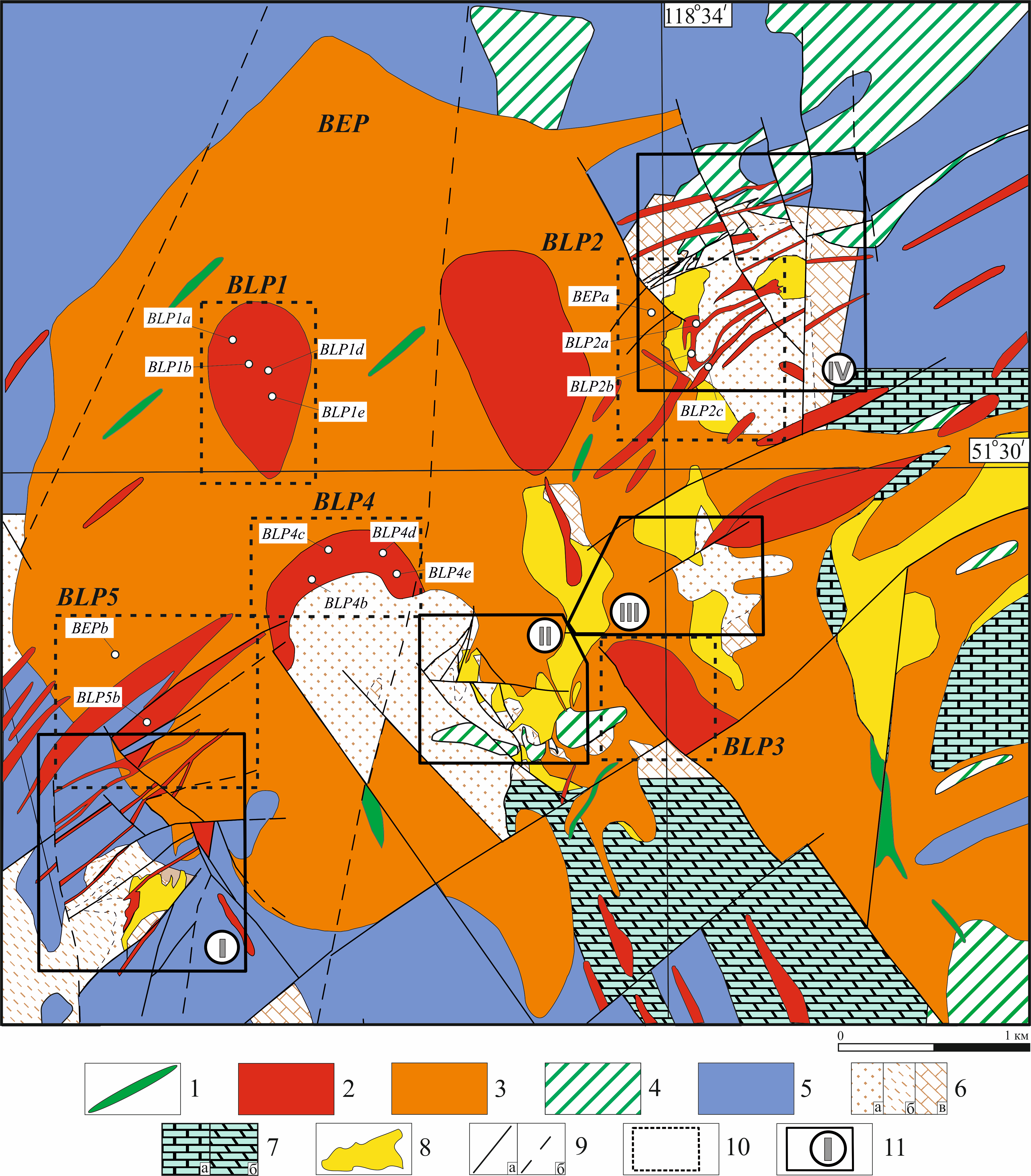 Фиг. 2. Геологическая карта Быстринского месторождения (Коваленкер и др., 2019) и положение изученных образцов: 1 — позднеюрские базальты, андезиты, лампрофировые дайки (нерчинскозаводской комплекс); 2 — позднеюрские гранодиорит-порфиры, гранит-порфиры поздней фазы (шахтаминский комплекс); 3 — позднеюрские диориты, монцониты, монцонит-порфиры поздней фазы (шахтаминский комплекс); 4 — средне-позднеюрские андезиты, базальты и его туфы, субвулканические андезиты (шадоронский комплекс); 5 — раннеюрские песчаники, алевролиты, аргиллиты (государевская свита); 6 — средний девон: (а) песчаники, (б) алевролиты, (в) известняки (ильдиканская свита); 7 — ранний кембрий: (а) известняки, (б) доломиты (быстринская свита); 8 — скарны; 9 — разломы: (а) доказанные, (б) предполагаемые; 10 — положение изученных штоков гранитоидов; 11 — участки месторождения: (I) Верх-Ильдикан, (II) Малый Медный Чайник, (III) Южно-Родственный, (IV) Быстринский-2.