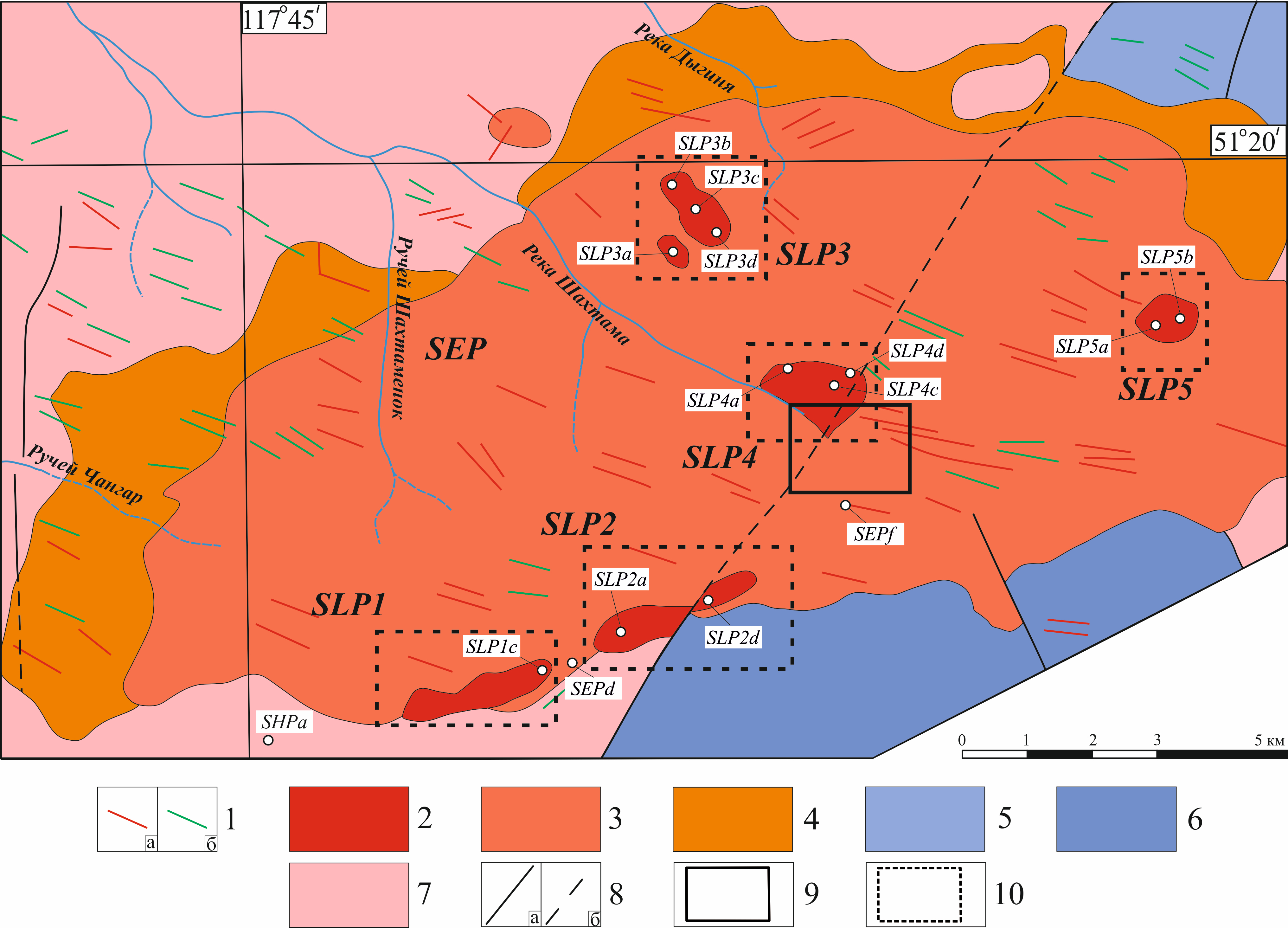Шахтаминское Mo–порфировое месторождение расположено в 50 км на юго-запад от Быстринского (фиг. 3). Вмещающими породами Шахтаминского месторождения выступают магматические породы одноименного массива, являющегося петротипом шахтаминского комплекса в Восточном Забайкалье. Массив прорывает пермские гранодиориты ундинского комплекса (SHP — Shakhtama Host Porphyry) и терригенные отложения нижней юры (фиг. 3). Крупное тело порфировидных гранитов ранней фазы шахтаминского комплекса (породы рамы, SEP — Shakhtama Early Porphyry) прорвано серией более мелких штокоподобных тел порфировидных гранитов (SLP1–2 — Shakhtama Late Porphyry) и гранодиорит–порфиров третьей фазы шахтаминского комплекса (SLP3–5). Проведенные ранее исследования (Nevolko et al., 2021) доказали рудоносность только одного штока SLP4. При этом намечалась слабая потенциальная рудоносность штока SLP5 на основании валовой геохимии. Время формирования Шахтаминского месторождения соответствует возрастному интервалу 161–164 млн лет. Минерализация на Шахтаминском месторождении представлена многочисленными кварцевыми жилами и жильными зонами, вмещающие породы между которыми нередко подвержены в значительной степени метасоматическому преобразованию. Аналогично Быстринскому месторождению, останавливаться на детальной характеристике Шахтаминского месторождения не будем. Имеющаяся информация по геологическому строению и вещественному составу руд приведена в ряде работ предшественников (Рутштейн и др., 2002; Берзина и др., 2013; Berzina et al., 2016; Nevolko et al., 2021).