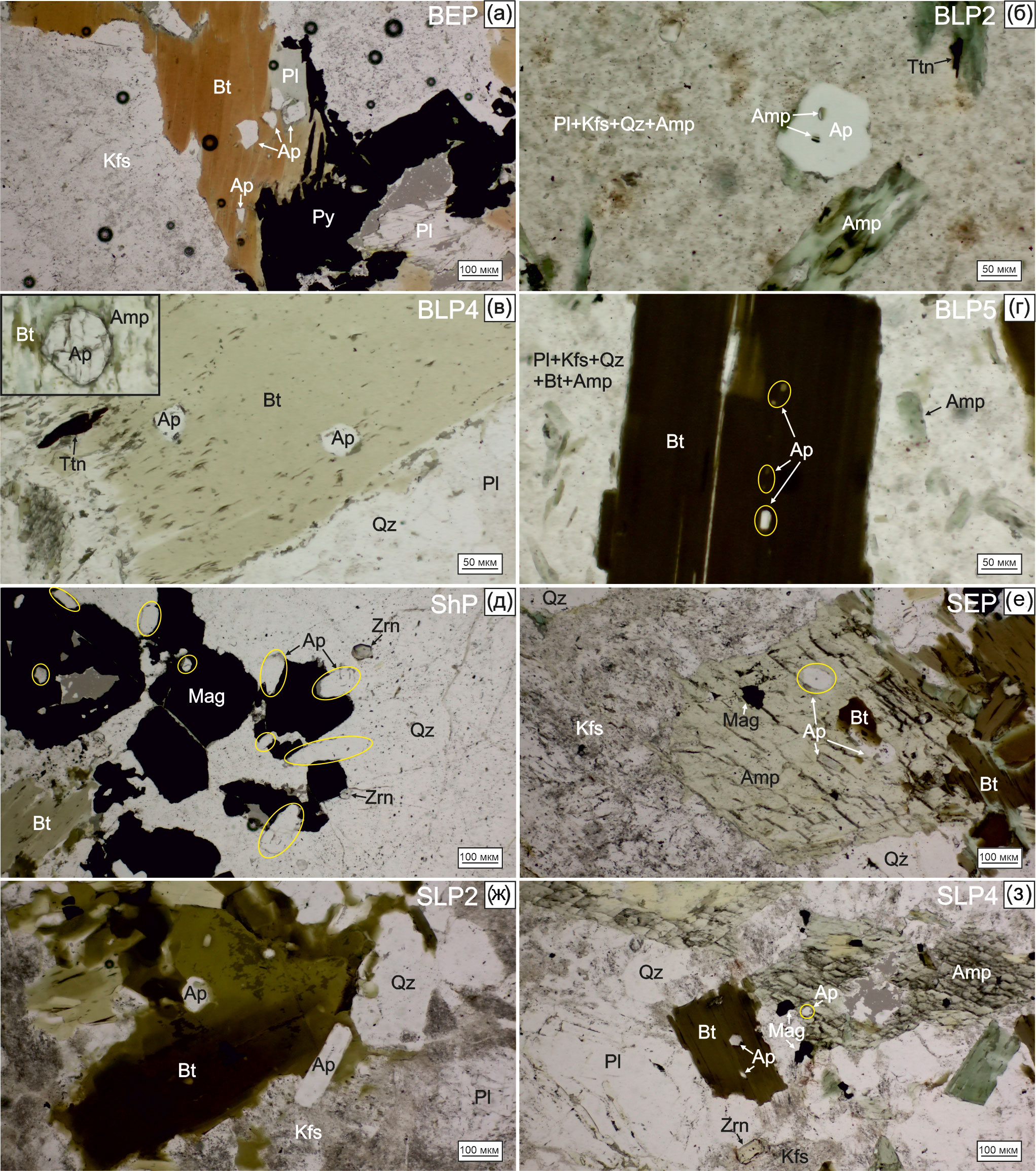 Апатит в изученных образцах как ранней, так и поздней фазы представлен в виде идиоморфных включений кристаллов в биотите и амфиболе (фиг. 4а, в, г). Размер кристаллов апатита обычно не превышает 50 мкм. В образцах BLP2 апатит присутствует как среди основной массы породы, так и в виде включений в амфиболе, при этом размеры кристаллов апатита достигают 100 мкм (фиг. 4б). В образце BLP5 встречаются кристаллы апатита, пространственно приуроченные к плоскостям спайности биотита (фиг. 4г).