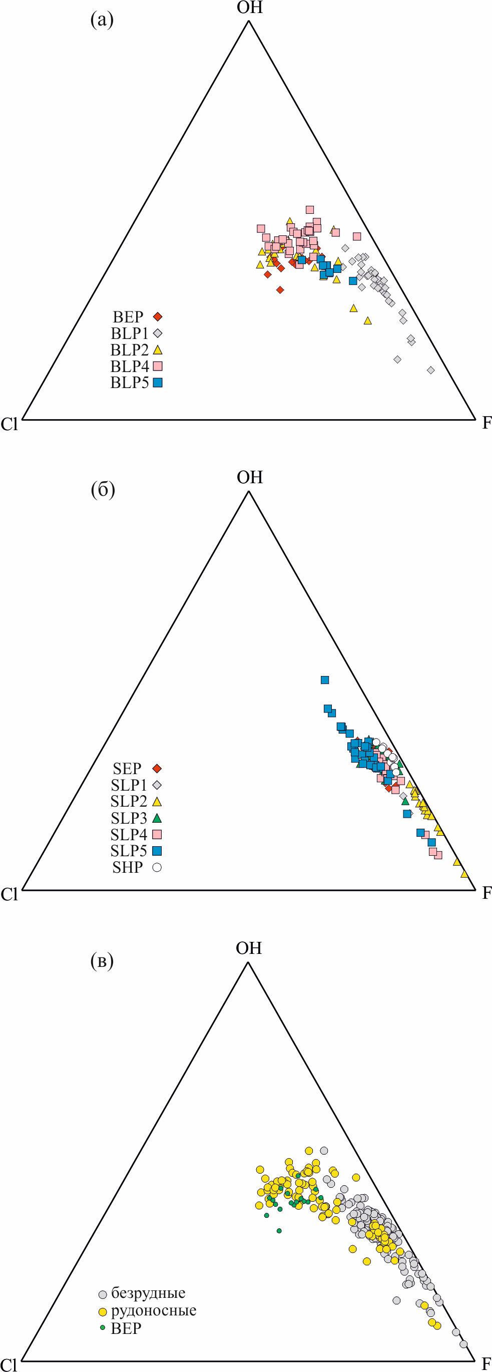 Фиг. 5. Трехкомпонентные диаграммы состава летучих (Cl–OH–F) компонентов апатита (формульные единицы) для минерала магматических пород шахтаминского комплекса: (а) — Быстринское месторождение; (б) — Шахтаминское месторождение; (в) — вся выборка с разделением на апатиты из рудоносных и безрудных пород.