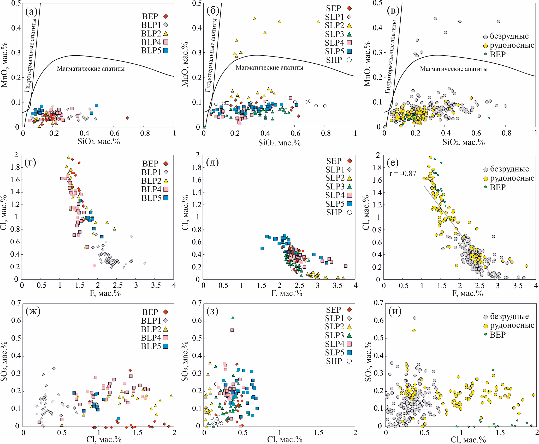 Установлено повышенное содержание S в апатите из магматических пород поздней фазы Быстринского месторождения, как рудоносных (BLP2–5), так и безрудных (BLP1) — 0.17 и 0.13 мас. % SO3 соответственно. При этом содержание S в апатите из монцонитов ранней фазы (BEP) не превышает 0.04 мас. % SO3, за исключением одного анализа с содержанием 0.32 мас. % SO3 (фиг. 6ж). Для апатита пород поздней фазы (SLP1–2) Шахтаминского месторождения характерно относительно повышенное содержание серы (0.14 мас. % SO3), минимальные значения выявлены для апатита вмещающих пород ундинского комплекса (SHP) и гранодиоритов ранней фазы шахтаминского комплекса (SEP) — 0.05 и 0.11 мас. % SO3 соответственно. Наибольшее содержание серы установлено в порфирах, слагающих штоки c третьего по пятый (SLP3–5) — (ср. знач.): 0.14, 0.20, 0.19 мас. % SO3 соответственно (фиг. 6з).