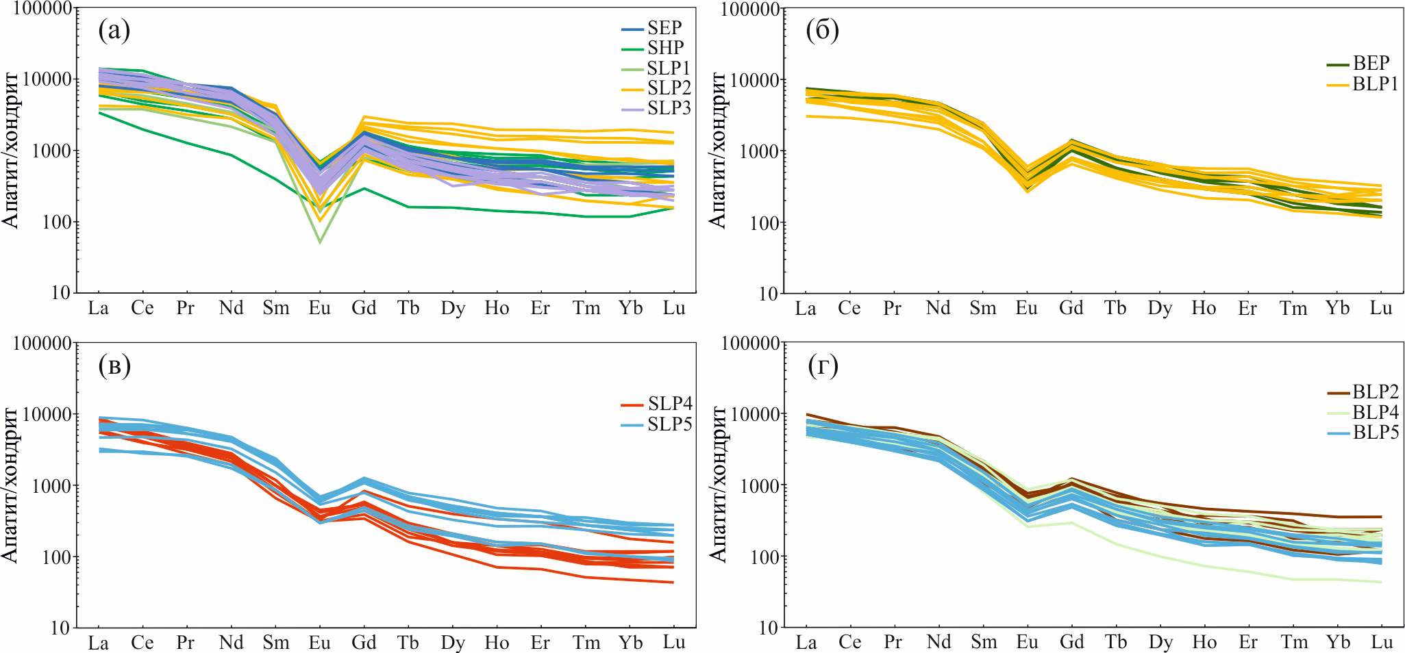 Спектры распределения REE в апатитах из всех магматических ассоциаций характеризуются пологой конфигурацией с незначительным обогащением LREE относительно HREE и отчетливо выраженной европиевой аномалией (фиг. 7а-г). Апатит из рудоносных гранит-порфиров Шахтаминского месторождения (SLP4) характеризуется наименьшим суммарным содержанием редкоземельных элементов, которое варьирует от 5306 до 7366 г/т (ср. зн. 6650). Апатит из безрудных гранитоидов Шахтаминского месторождения характеризуется суммарным содержанием редкоземельных элементов в интервале от 2752 до 16299 г/т (ср. зн. 10884 г/т) (фиг. 7а, в). Для апатита магматических пород Быстринского месторождения прослеживается тенденция уменьшения общего содержания REE от штока BLP2 к штоку BLP5 (BLP2: 5798–9674 г/т, cр. зн. 8223; BLP4: 6169–8846 г/т, cр. зн. 7182; для BLP5: 5240–8596 г/т, ср. зн. 6537), с которыми связано порфировое оруденение (фиг. 7б, г).