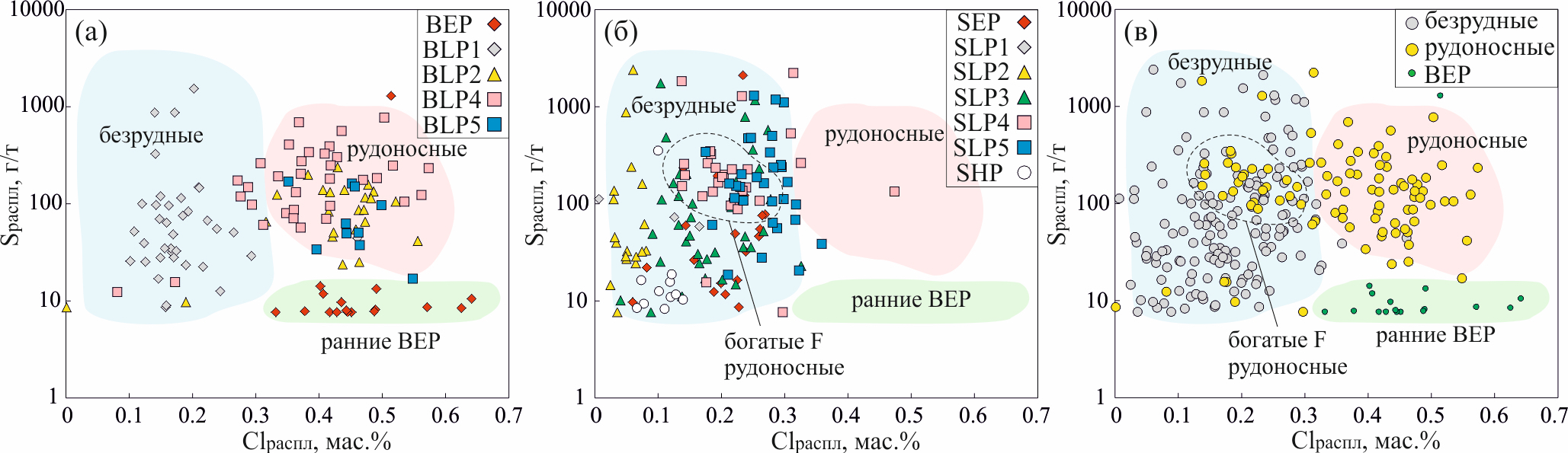 Согласно формуле Parat (2011), средние значения Sраспл в породах рудоносных штоков Быстринского месторождения BLP2–5 (ср. зн. 158.18 г/т, n = 66) выше, чем в образцах из безрудных пород BLP1 и BEP (ср. зн. 147.07 г/т, n = 37 и ср. зн. 84.77 г/т, n = 17 соответственно). Оцененные Sраспл для образцов Шахтаминского месторождения наибольшие для гранитоидов штоков SLP4–5 (ср. зн. 314.29 г/т, n = 59). Для оценки содержания Cl в расплаве использовалась формула (Li, Hermann, 2017). Оцененные Clраспл в безрудных породах ранней фазы (BEP) и рудоносных породах поздних штоков (BLP2–5) значительно больше (ср. зн. 0.42 мас. %, n = 83), чем в безрудных образцах BLP1 (ср. зн. 0.18 мас. %, n = 37). В магматических породах, распространенных на площади Шахтаминского месторождения, значения Clраспл для 4 рудоносного штока (SLP4) и потенциально рудного 5 штока (SLP5) близки (ср. зн. 0.22 мас.%, n = 28 и ср. зн. 0.27 мас. %, n = 31 соответственно). В то же время гранитоиды, с которыми не связано оруденение (SHP, SEP, SLP1–3), хоть и имеют перекрытие с рудоносными, характеризуются меньшими оцененными содержаниями Clраспл (ср. зн. 0.15 мас. %, n = 88).