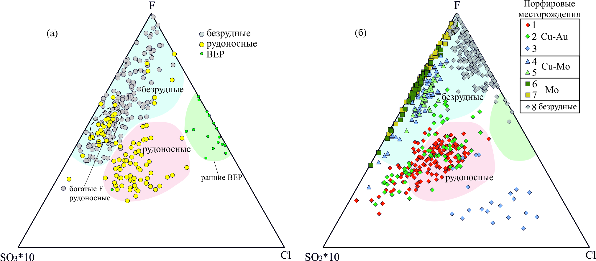Фиг. 10. Трехкомпонентные диаграммы дискриминации апатита из рудоносных и безрудных магматических пород в координатах Cl–F-10*SO3 (мас. % нормированные на 100%): (a) по результатам текущего исследования; (б) 1–7: состав апатита из рудоносных магматических пород по литературным данным (1 — Cu-Au порфировое месторождение Ред Крис (Zhu et al., 2018); 2 — Cu-Au порфировое месторождение Кармен де Андаколло (Richards et al., 2017); 3 — Cu-Au порфировое месторождение Малмыж (неопубликованные данные авторов); 4 — Cu-Mo порфировое месторождение Цулун (Xu et al., 2021); 5 — Cu-Mo порфировое месторождение Чжунуо (Xu et al., 2021); 6 — Mo порфировое месторождение Хуоцзихэ (Xing et al., 2020); 7 — Mo порфировое месторождение Дахэйшань (Xing et al., 2021)); 8 — состав апатита из гранитоидов шахтаминского комплекса, с которыми не ассоциировано оруденение (неопубликованные данные авторов).