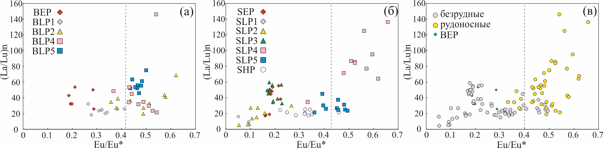 Фиг. 11. Диаграмма отношения (La/Lu)n к Eu/Eu* в апатите: (а) — Быстринское месторождение; (б) — Шахтаминское месторождение; (в) — вся выборка с разделением на апатиты из рудоносных и безрудных пород.