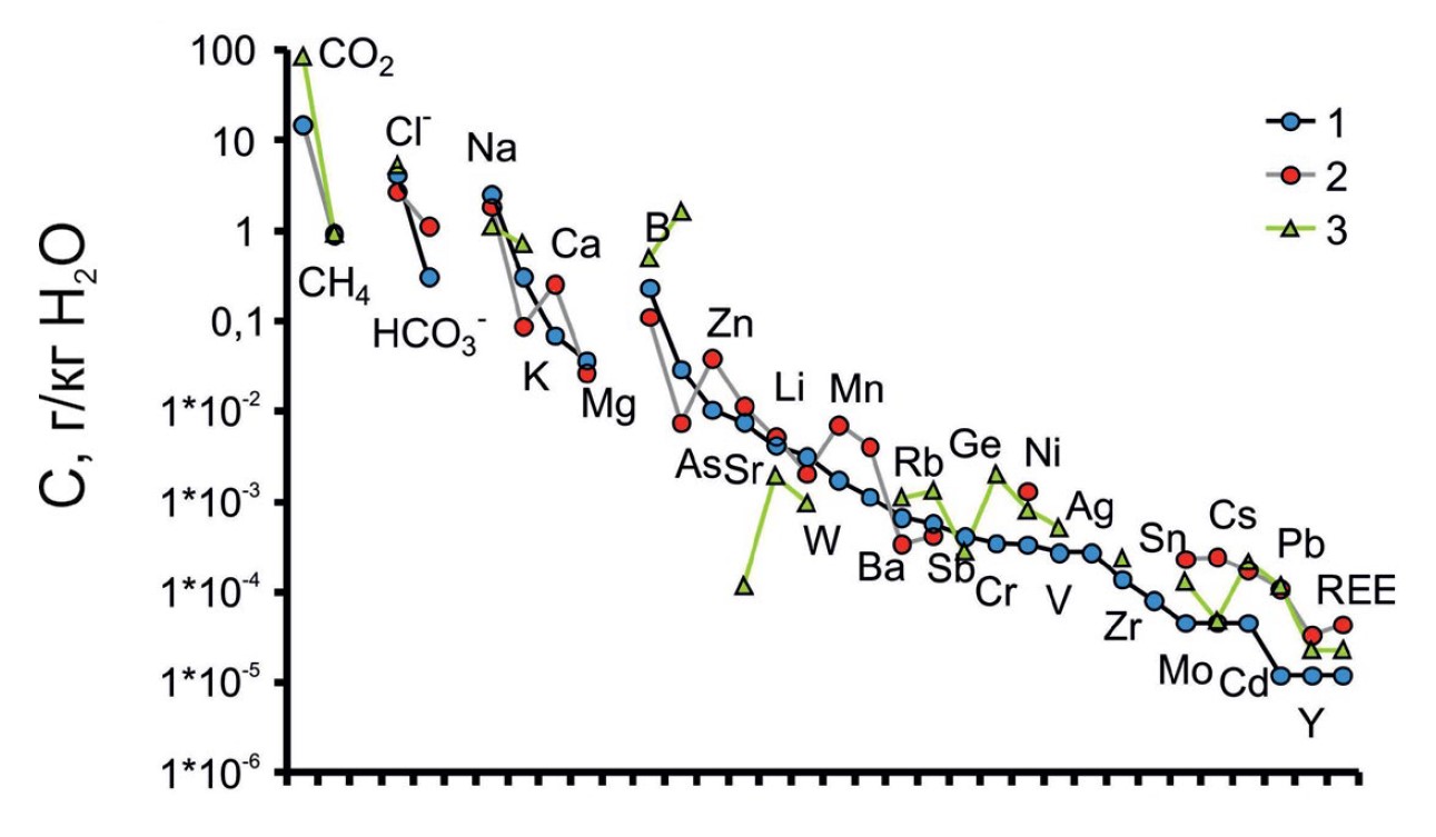Во флюиде также обнаружены (г/кг воды) углекислота (14.8—86.3), метан (0.90—0.94) и ряд микрокомпонентов (мг/кг воды): Br (109), As (7.6—1648), Li (1.9—5.3), B (112—497), Rb (0.34—1.11), Cs (0.05—0.24), Sr (0.12—11.53), Mo (0.05—0.23), Ag (0.28), Sb (0.42—1.35), Zn (10.4—38.5), Cd (0.05—0.22), Pb (0.01—0.12), Bi (до 0.02), Th (до 0.01), Ga (0.20), Ge (0.28—0.42), Mn (1.74—7.16), Fe (до 3.5), Co (до 0.04), Ni (0.34—1.32), V (0.28—0.52), Cr (0.35—1.99), Y (0.01—0.03), Zr (0.14—0.24), Sn (0.08), Ba (1.14—4.09), W (0.98—3.18), Hg (до 0.15), Tl (до 0.10), и REE (0.01—0.04). Основные показатели состава флюида: CO2/CH4 = 15.8—91.5, Na/K = =1.6—21.1, а K/Rb = 254—641.