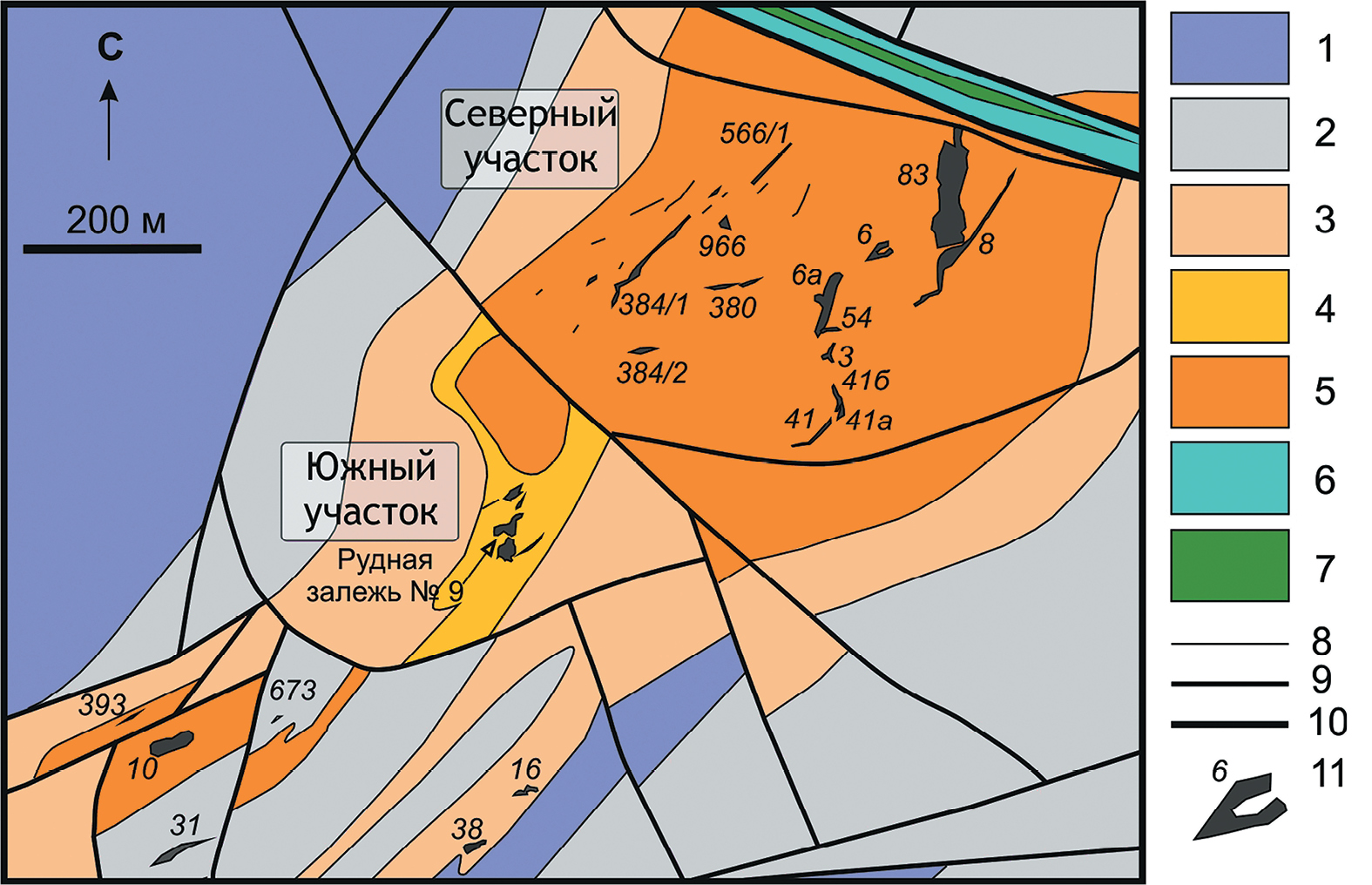 Фиг. 2. Схематическая геологическая карта месторождения Центральное (по материалам (Перевозчиков и др., 2005; Ширяев, Вахрушева, 2017)). Условные обозначения: 1 – 4 породы дунит-гарцбургитового комплекса с различным содержанием дунитовой составляющей (1 – <10%; 2–10–30%; 3–30–50%; 4–50–70%); 5 – дуниты; 6 – серпентиниты; 7 – диабазы; 8 – геологические границы; 9, 10 – тектонические нарушения 1-го и 2-го ранга соответственно; 11 – тела хромовых руд и их номера.