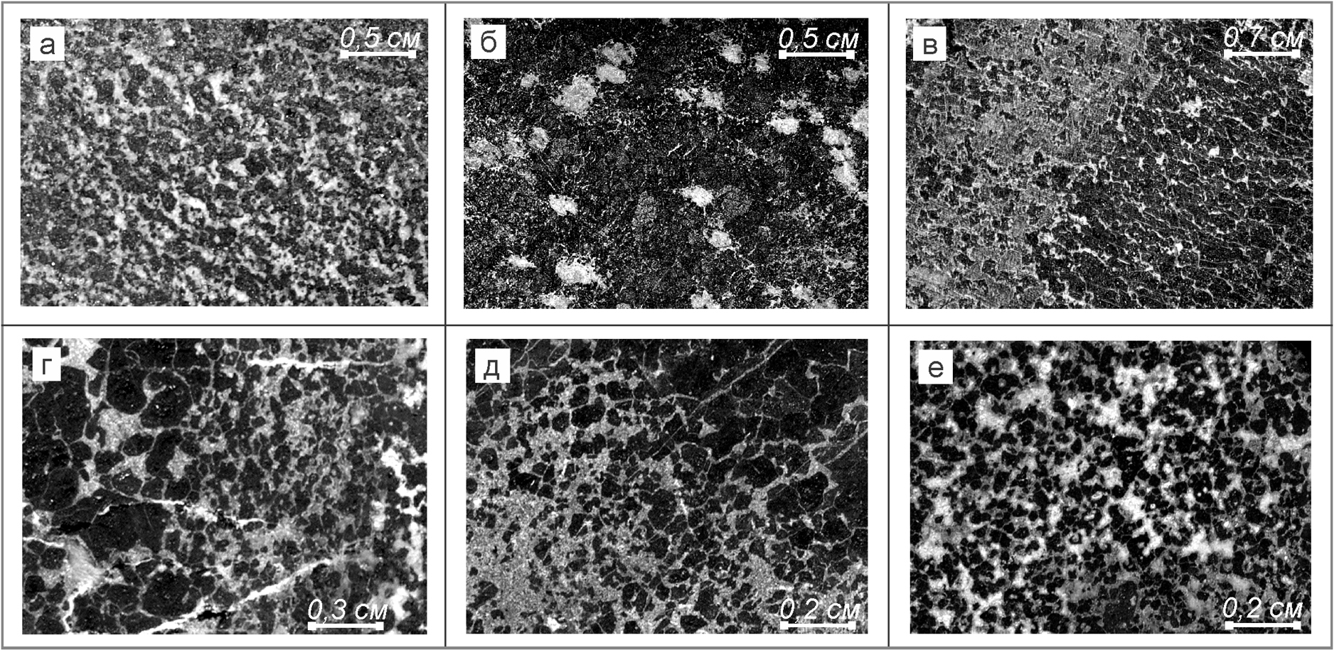 Фиг. 4. Типы хромовых руд Войкаро-Сыньинского массива: рудопроявление Ямботывисское (а, б, в) и Аркашорское (г, д, е). Фото полированных срезов. а – средневкрапленная, среднезернистая; б – порфировидная, густовкрапленная мелкозернистая; в – полосчатая, шлирово-вкрапленная, среднезернистая; г – средневкрапленная, неравномернозернистая мелко-среднезернистая; д – шлирово-вкрапленная, неравномернозернистая мелко-среднезернистая; е – средневкрапленная, мелкозернистая.