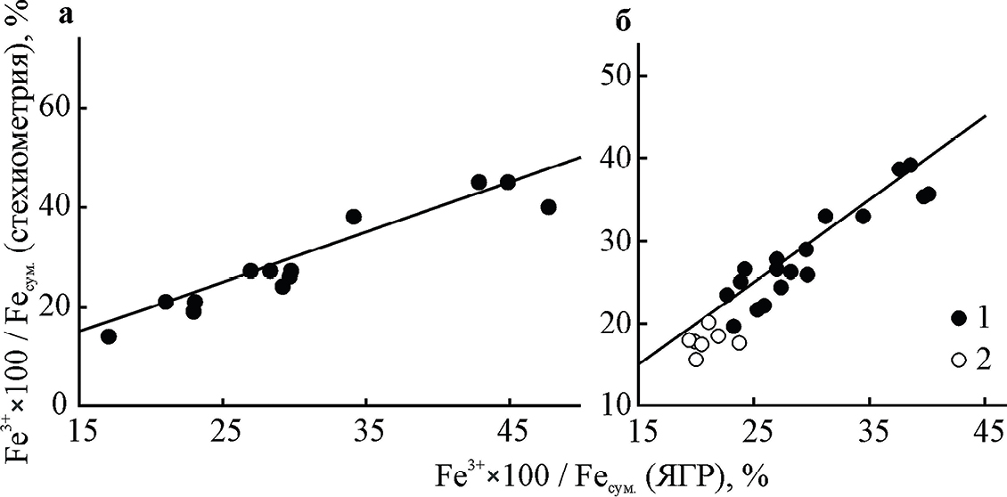 Таблица 1. Степень окисления железа (Fe#), определенная при помощи ЯГР-спектроскопии (ЯГР) и при пересчете состава минерала на стехиометрическую формулу (Стех.) в пробах с изученной химической зональностью