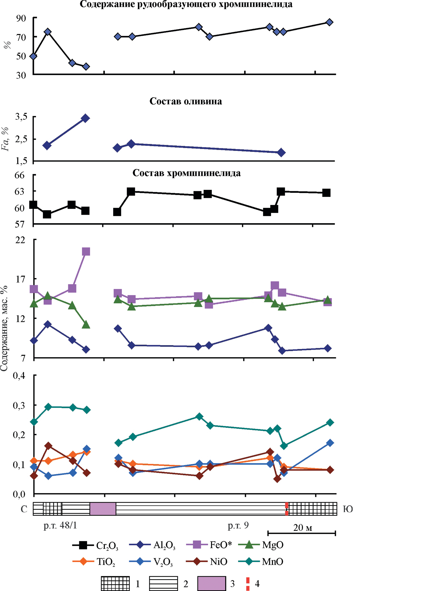 На фиг. 6 показано изменение содержания химических компонентов в хромшпинелидах и оливинах по разрезу через рудные тела № 48/1 и № 9 рудной залежи № 9, вскрытой в штольне месторождения Центральное на горизонте 480 м. Сравнивались составы, определенные в центральных частях зерен минерала. В рудном теле № 48/1 фиг. 6 наблюдается повышение к контактам содержаний FeO и V2O3, а количество MgO, Al2O3, MnO, NiO в шпинелиде, напротив, снижается. Содержание Cr2O3 в минерале варьирует по разрезу слабо, в пределах 59–60.5 мас. %.