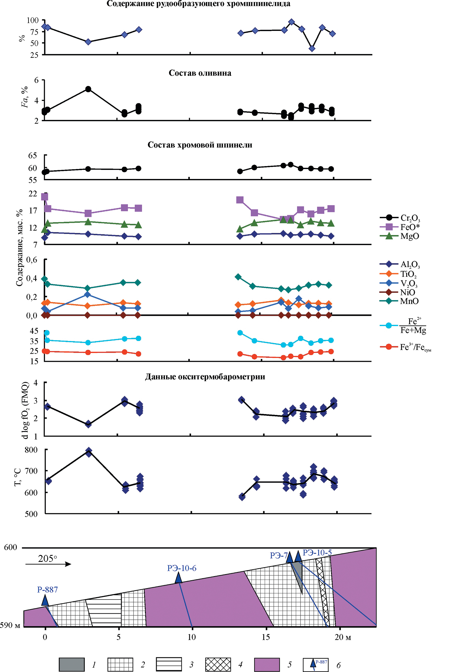 Фиг. 7. Вариации химического состава рудообразующего хромшпинелида, T и fO2 по разрезу через рудное тело № 10, месторождение Центральное. Условные обозначения: 1–5 хромовые руды: 1 – сплошные, 2 – густовкрапленные, 3 – средневкрапленные, 4 – редковкрапленные; 5 – рудовмещающие дуниты; 6 – буровые скважины и их номера.