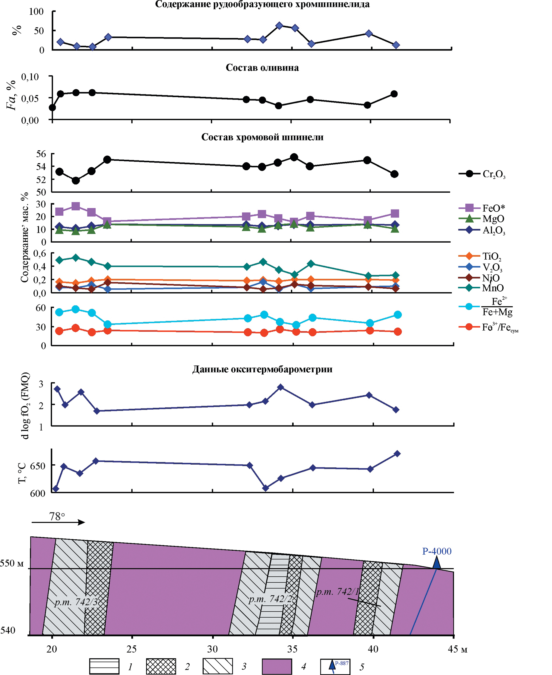 Фиг. 8. Вариации химического состава рудообразующего хромшпинелида, T и fO2 по разрезу через рудные тела № 742/1, 742/2, 742/3, рудопроявление Енгайское-1. Условные обозначения: 1–3 хромовые руды: 1 – средневкрапленные, 2 – редковкрапленные; 3 – убоговкрапленные; 4 – рудовмещающие дуниты; 5 – буровые скважины и их номера.