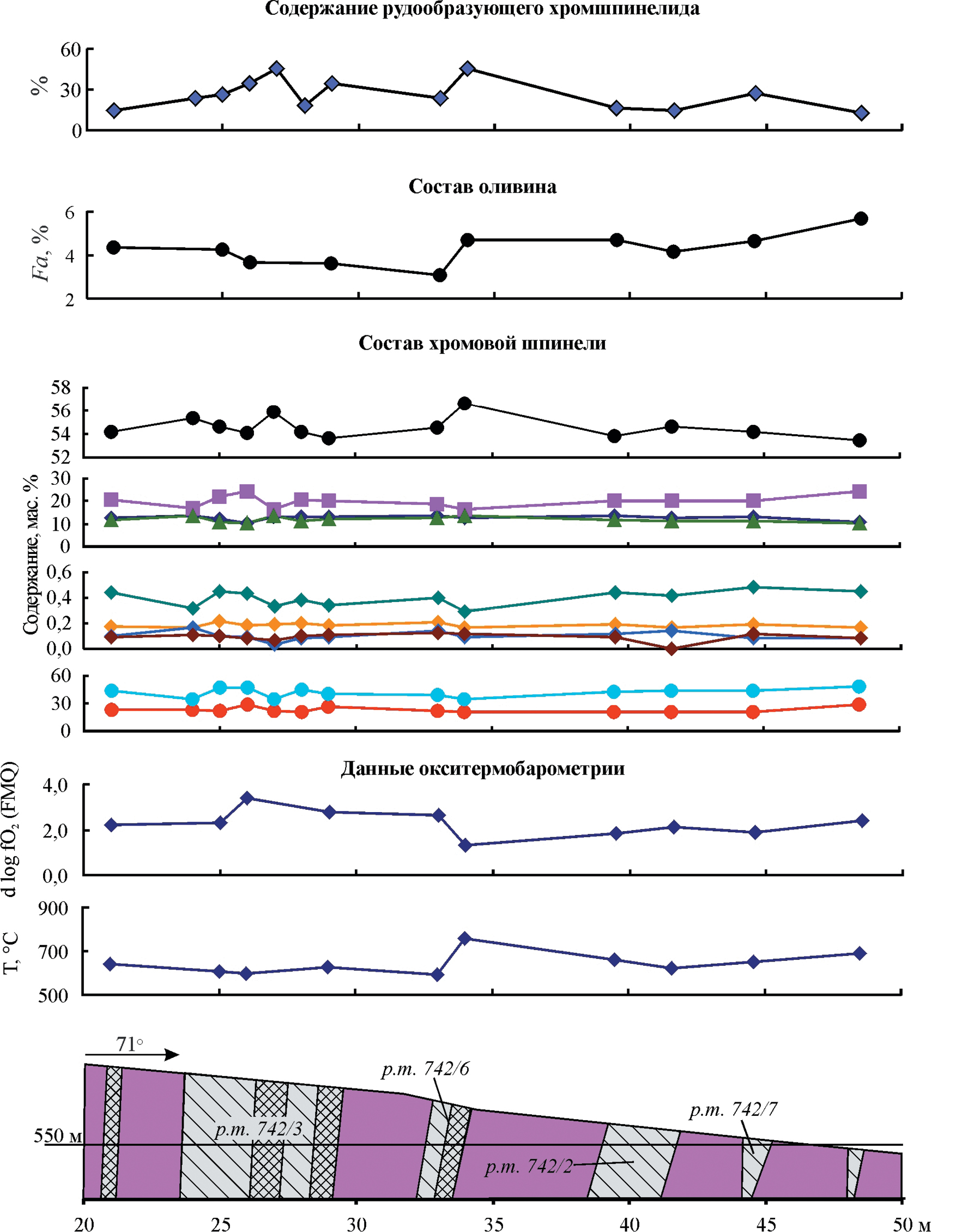 Фиг. 9. Вариации химического состава рудообразующего хромшпинелида, T и fO2 по разрезу через рудные тела № 742/2, 742/3, 742/6, 742/7, рудопроявление Енгайское-1. Условные обозначения см. фиг. 8.