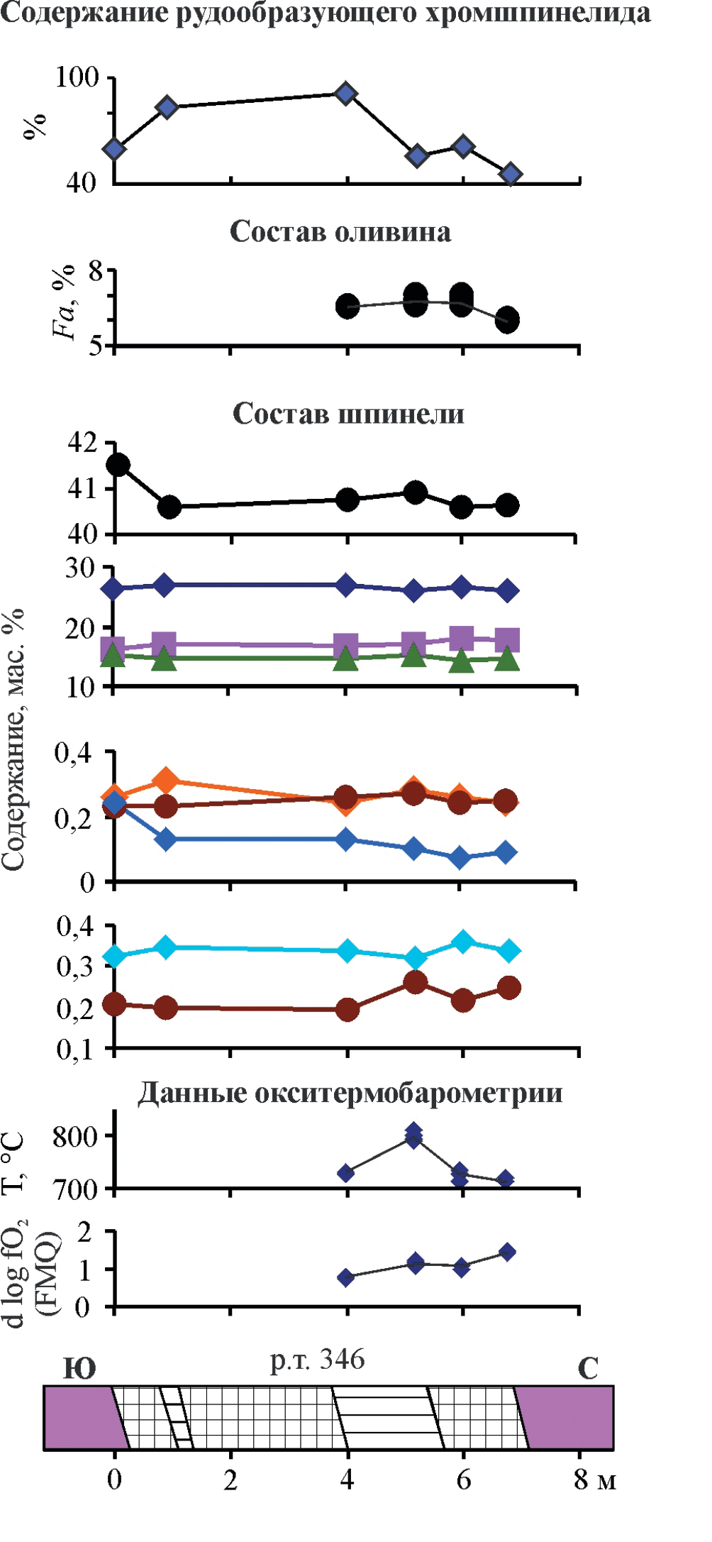 Фиг. 11. Изменение химического состава рудообразующего шпинелида, температуры оливин-хромшпинелевого равновесия и фугитивности кислорода внутри тела хромититов № 346 Ямботывисской площади. Условные обозначения см. фиг. 10.