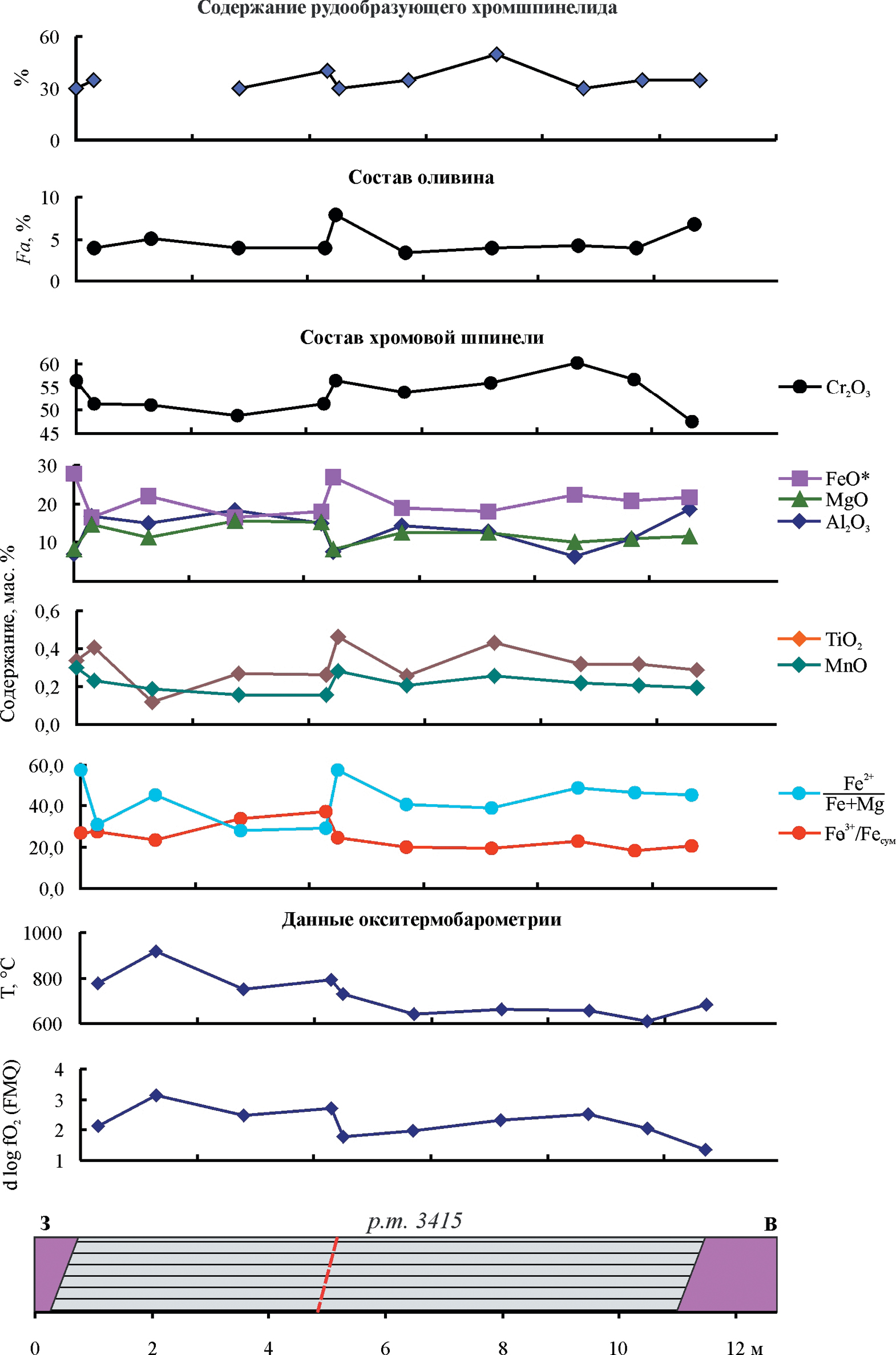 Фиг. 12. Изменение химического состава рудообразующего шпинелида, температуры оливин-шпинелевого равновесия и фугитивности кислорода внутри тела хромититов 3415 Аркашорского рудопроявления. Красный пунктир – тектоническое нарушение, остальные условные обозначения см. на фиг. 10.