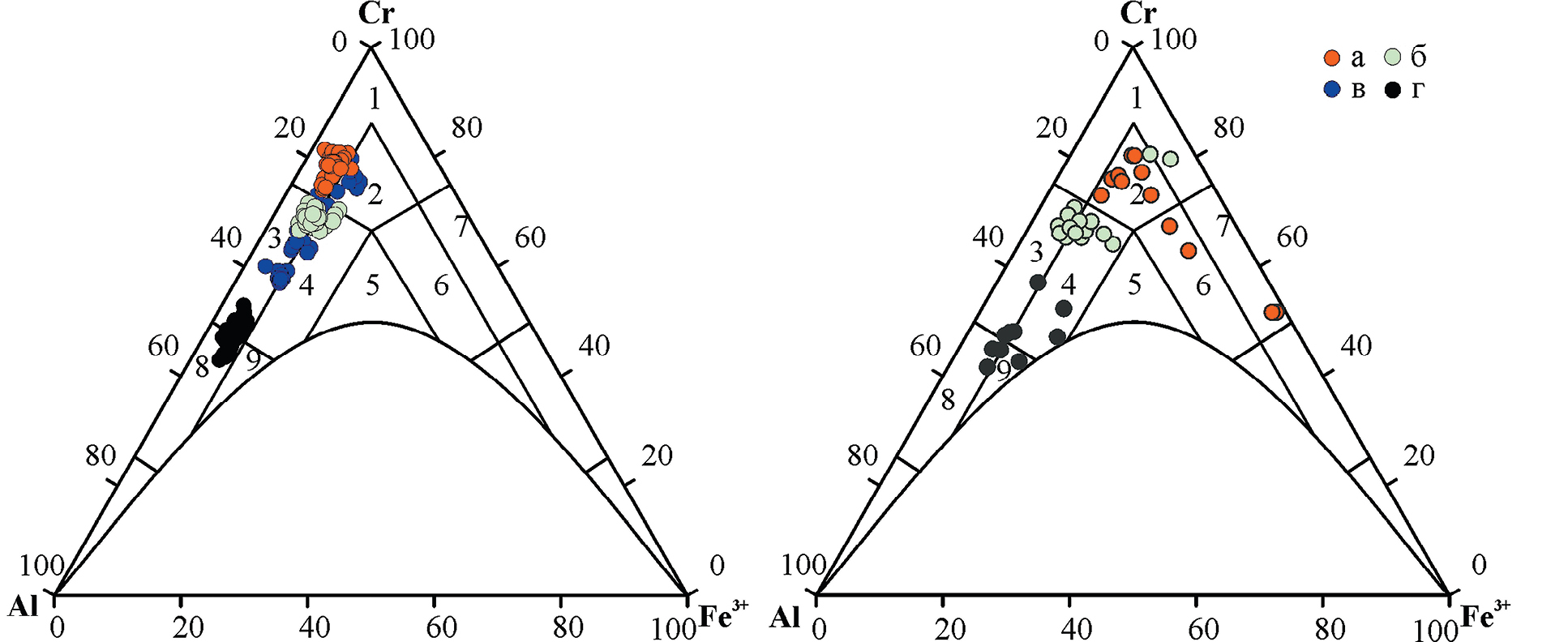 Фиг. 14. Диаграмма составов изученных рудообразующих (слева) и акцессорных (справа) хромшпинелидов массивов Рай-Из и Войкаро-Сыньинский. Условные обозначения: а – месторождение Центральное; б – рудопроявление Енгайское-1; в – рудопроявление Аркашорское; г – рудопроявления Ямботывисской площади. Поля составов по классификации Н.В. Павлова (1949, 1968): 1 – хромит, 2 – субферрихромит, 3 – алюмохромит, 4 – субферриалюмохромит, 5 – ферриалюмохромит, 6 – субалюмоферрихромит, 7 – феррихромит, 8 – хромпикотит, 9 – субферрихромпикотит.