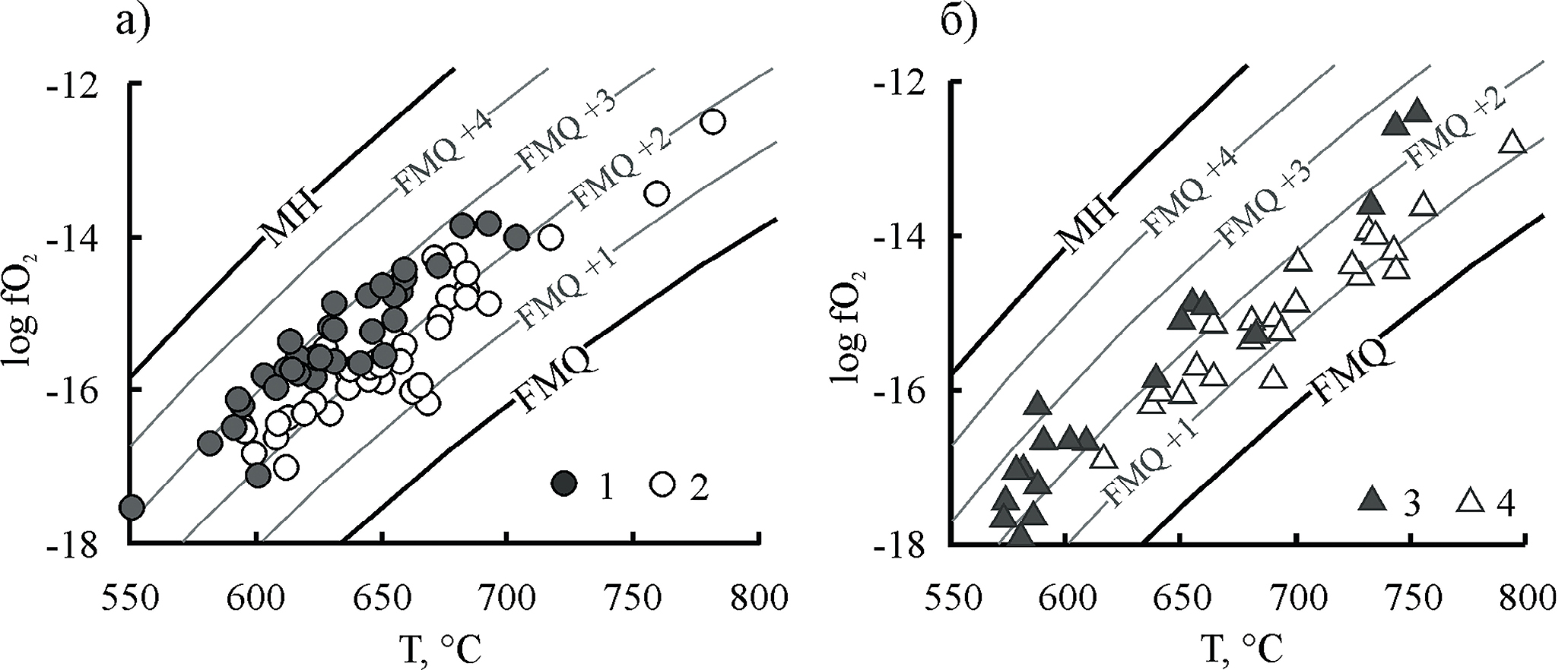 Фиг. 15. Диаграмма T – log fO2 для хромититов массивов Рай-Из (а) и Войкаро-Сыньинский (б). Условные обозначения: 1 – месторождение Центральное; 2 – рудопроявление Енгайское-1; 3 – Аркашорское рудопроявление; 4 – рудопроявления Ямботывисской площади.