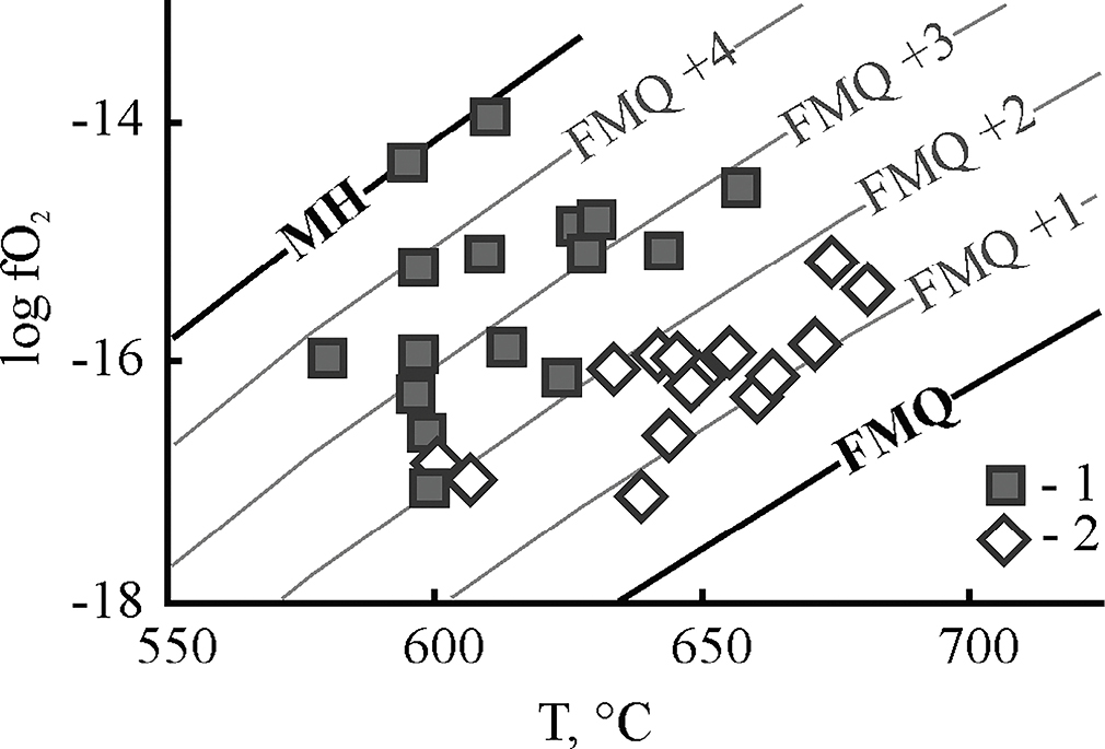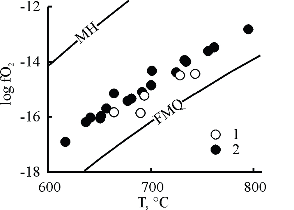 Как в глиноземистых, так и в высокохромистых хромовых рудах Кемпирсайского массива определены значения фугитивности кислорода от FMQ –1 до +1.4 лог. ед. при температуре оливин-шпинелевого равновесия 1000–1100оC (Чащухин и др., 2007). Авторы отмечают, что в крупных рудных телах наблюдается увеличение fO2 с глубиной, что, по их мнению, свидетельствует о переносе рудных компонентов при хромитообразовании восстановленным флюидом. В работе Ф. Мельчера с соавторами получены данные о более окислительных условиях образования высокохромистых хромититов этого массива – FMQ +2 при температуре 1000–1200оC (Melcher et al., 1997). В другом исследовании хромититов Кемпирсайского массива (Hu et al., 2022) установлены значения fO2 во вкрапленных разновидностях – FMQ +1.6, в сплошных – FMQ +1.4. В сплошных рудах для расчетов использован состав оливина из околорудных дунитов. Вариация параметров, установленных авторами исследований, может являться следствием гетерогенности месторождений хромититов Кемпирсая.