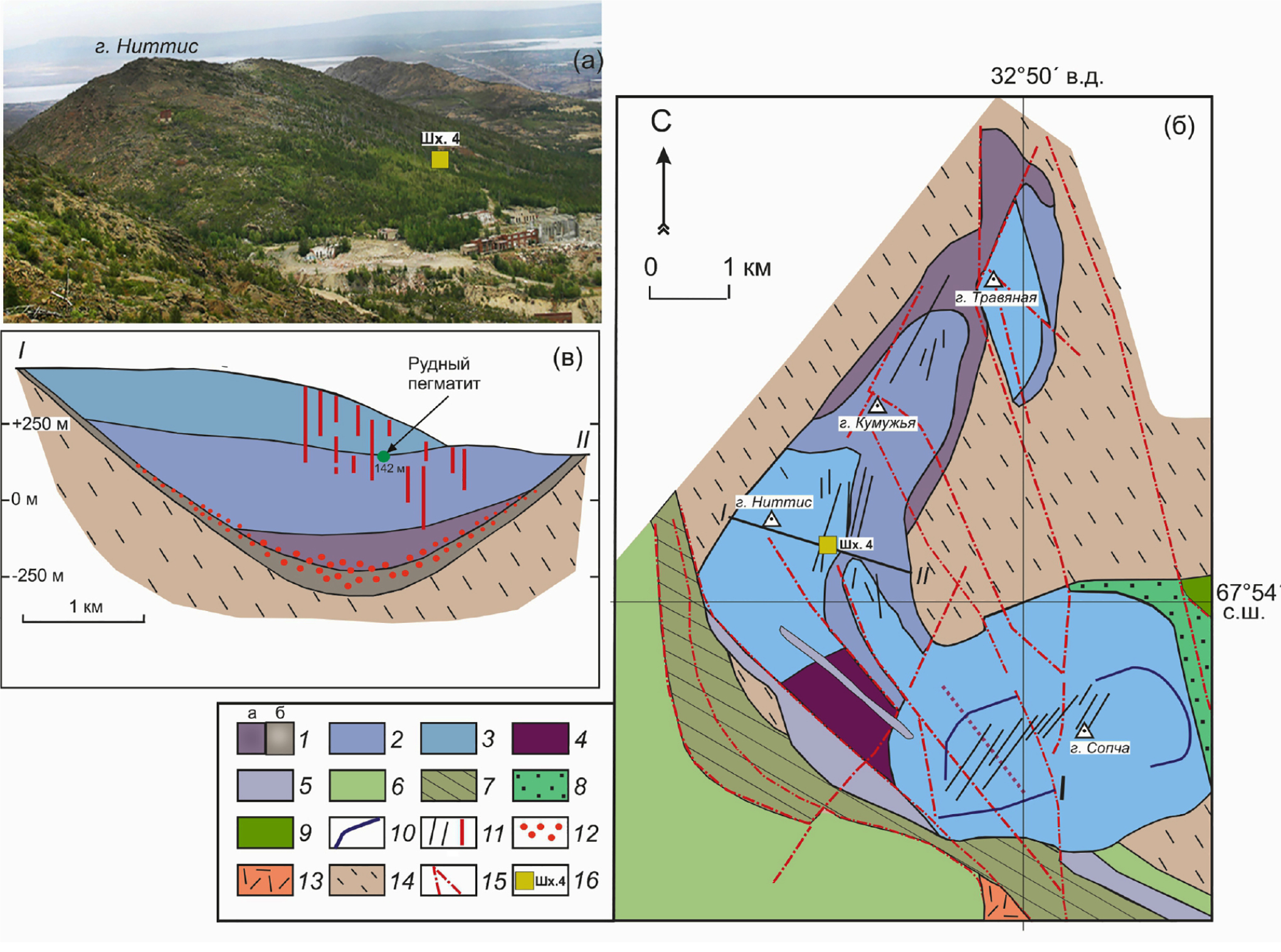 Фиг. 1. Панорама гор Ниттис, Кумужья и Травяная (НКТ) (а), схема геологического строения Северной камеры Мончеплутона (б) и геологический разрез по линии I–II (в). (б, в): 1 – гарцбургиты (а) и породы придонной зоны НКТ (б); 2 – переслаивание гарцбургитов, оливиновых ортопироксенитов и ортопироксенитов; 3 – ортопироксениты; 4 – дуниты, плагиодуниты и хромитовые руды “Дунитового блока”; 5 – дайки метагаббро, меланоноритов и ортопироксенитов; 6 – габбронориты, анортозиты Мончетундровского массива; 7 – бластоклазиты по габброидам; 8 – плагиоортопироксениты; 9 – меланонориты; 10 – рудный пласт “330” г. Сопчи; 11 – сульфидные жилы рудных полей НКТ и г. Сопчи; 12 – вкрапленные руды “Донной залежи” НКТ; 13 – вулканиты основного и кислого состава г. Арваренч; 14 – диориты, гранодиориты и гнейсы архейских комплексов; 15 – тектонические нарушения; 16 – местоположение шахты № 4 на г. Ниттис. По данным (Расслоенные …, 2004а) с авторскими изменениями.