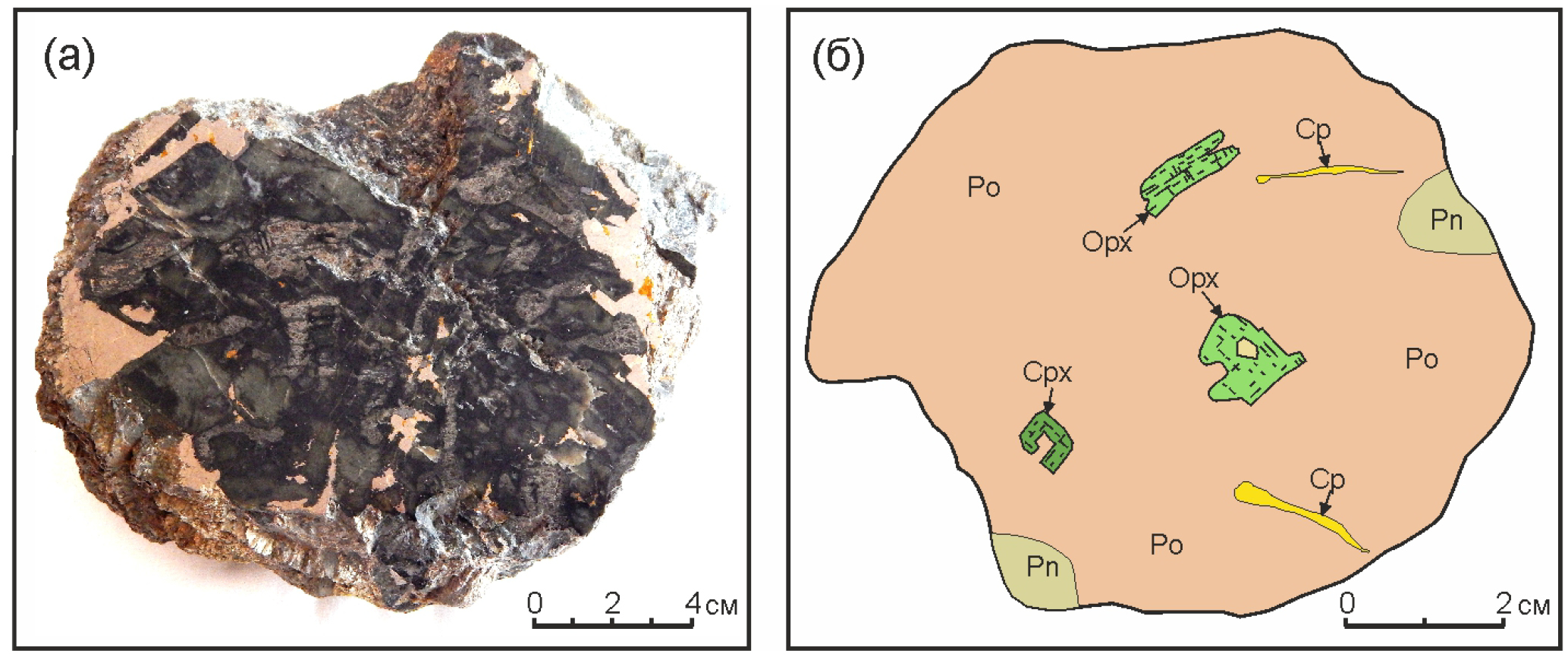 Фиг. 3. Текстуры рудного пегматита. а – полированный образец гигантозернистого рудного пегматита с крупными выделениями сульфидов в интерстициях кристаллов силикатных минералов (II зона) Розовато-желтый и белый цвет – сульфиды, темно-серый – кристаллы орто- и клинопироксенов, светло-серый – плагиоклаза. Образец из коллекции Музея Геологического института КНЦ ФИЦ РАН (г. Апатиты). б – зарисовка участка зоны сплошных сульфидов (I зона). Матрица сложена пирротином (Po) с порфировидными выделениями пентландита (Pn), включениями идиоморфных зерен ортопироксена (Opx), клинопироксена (Cpx) и прожилков халькопирита (Ccp).