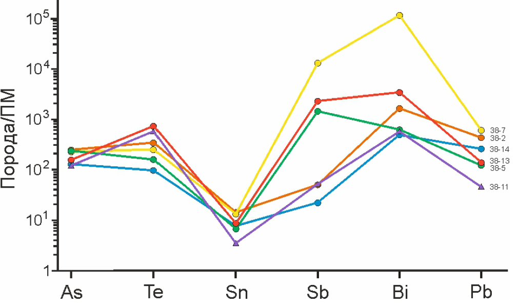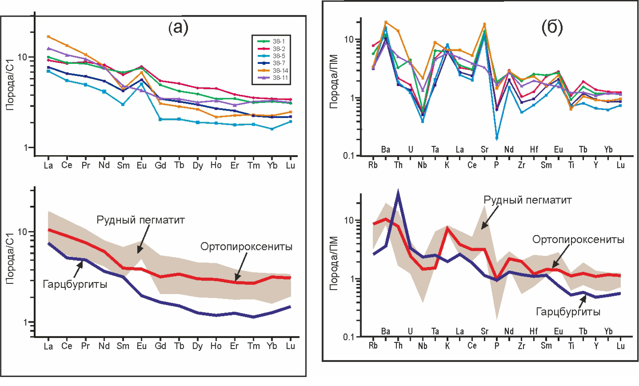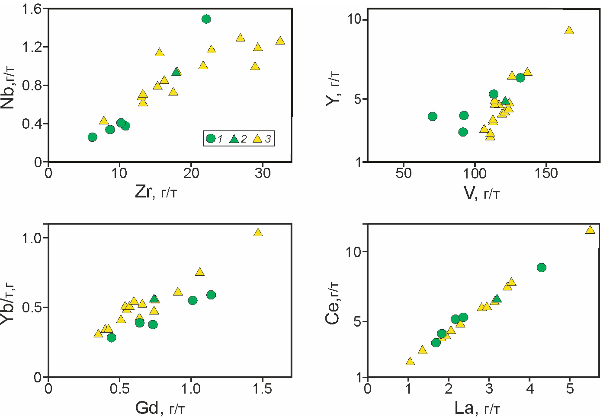 Концентрации рудных, редких и редкоземельных элементов определялись в Центре лабораторно-аналитических исследований ИМГРЭ методом ICP-MS на масс-спектрометре ELAN6100 DRC. При подготовке проб к анализу они предварительно истирались до пудры, затем помещались в тефлоновые стаканы и разлагались в автоклавах с помощью смеси плавиковой и азотной кислот в соотношении 5 : 1 при температуре 180оC в течение 24 ч. После медленного упаривания исследуемое вещество переводилось в раствор 3%-ной азотной кислотой с коэффициентом разбавления исходной пробы 103 и затем анализировалось на масс-спектрометре. Калибровка производилась с помощью растворов на основе High Purity Standarts ICP-MS-68B (Solution A + Solution B + Solution C), контроль точности BCR-2. В качестве внутреннего стандарта использовался индий. Пределы обнаружения элементов (по критерию 3σ) — 0.2—0.5, разрешение (а.е.м.) — 0.7, чувствительность по In115, импульс/c (концентрация 1 мг/л) — 3 × 107, погрешность — ±2.0.