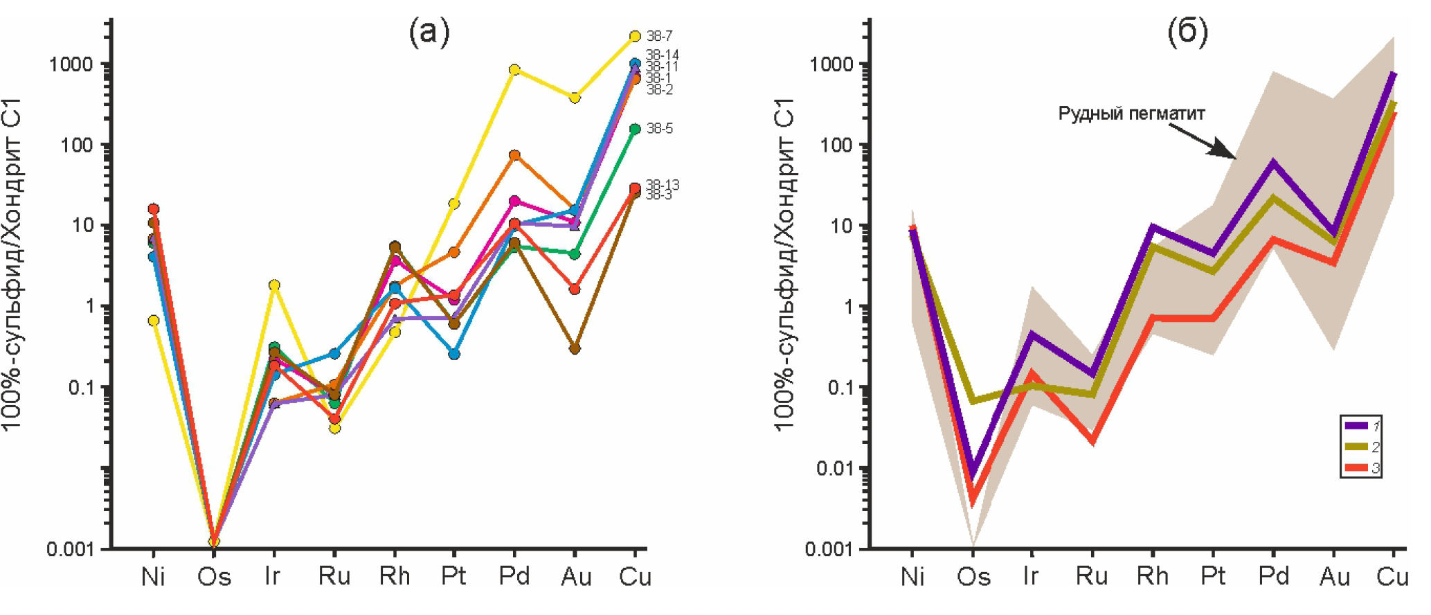 Содержания элементов платиновой группы (Pt, Pd, Rh, Ru, Ir, Os) и Re определены методом ICP-MS в ЦКП “Изотопно-геохимических исследований” ИГХ им. А.П. Виноградова СО РАН (Иркутск) на масс-спектрометре высокого разрешения Element 2 (Finnigan MAT) с использованием открытого кислотного разложения и отделением матричных элементов на катионите КУ-2—8 по методике (Меньшиков и др., 2016). Правильность определения концентраций и дрейф прибора контролировали по стандартным образцам Ж-3, РП-1 (Ru, Rh, Pd, Pt, Ir) и ЕСО-2 (Pd, Pt), также Jp-1 (Япония), DZE-1 (Китай) — (Ru, Rh, Pd, Pt, Ir). Значения пределов обнаружения, рассчитанные с учетом величины контрольного опыта и его стандартного отклонения (при переведении навески 1 г в 50 мл), составили (нг/г): для Ru — 0.5, Rh — 0.7, Pd — 4.0, Re — 0.2, Os — 0.8, Ir — 0.1, Pt –0.7. Относительные ошибки, полученные при измерении стандартов, не превышают 10%. Несколько проб были проанализированы для контроля на Pt и Pd в ЦКП “Геоспектр” ГИН СО РАН атомно-эмиссионным спектральным анализом. Полученные данные показали удовлетворительную сходимость с результатами метода ICP-MS.