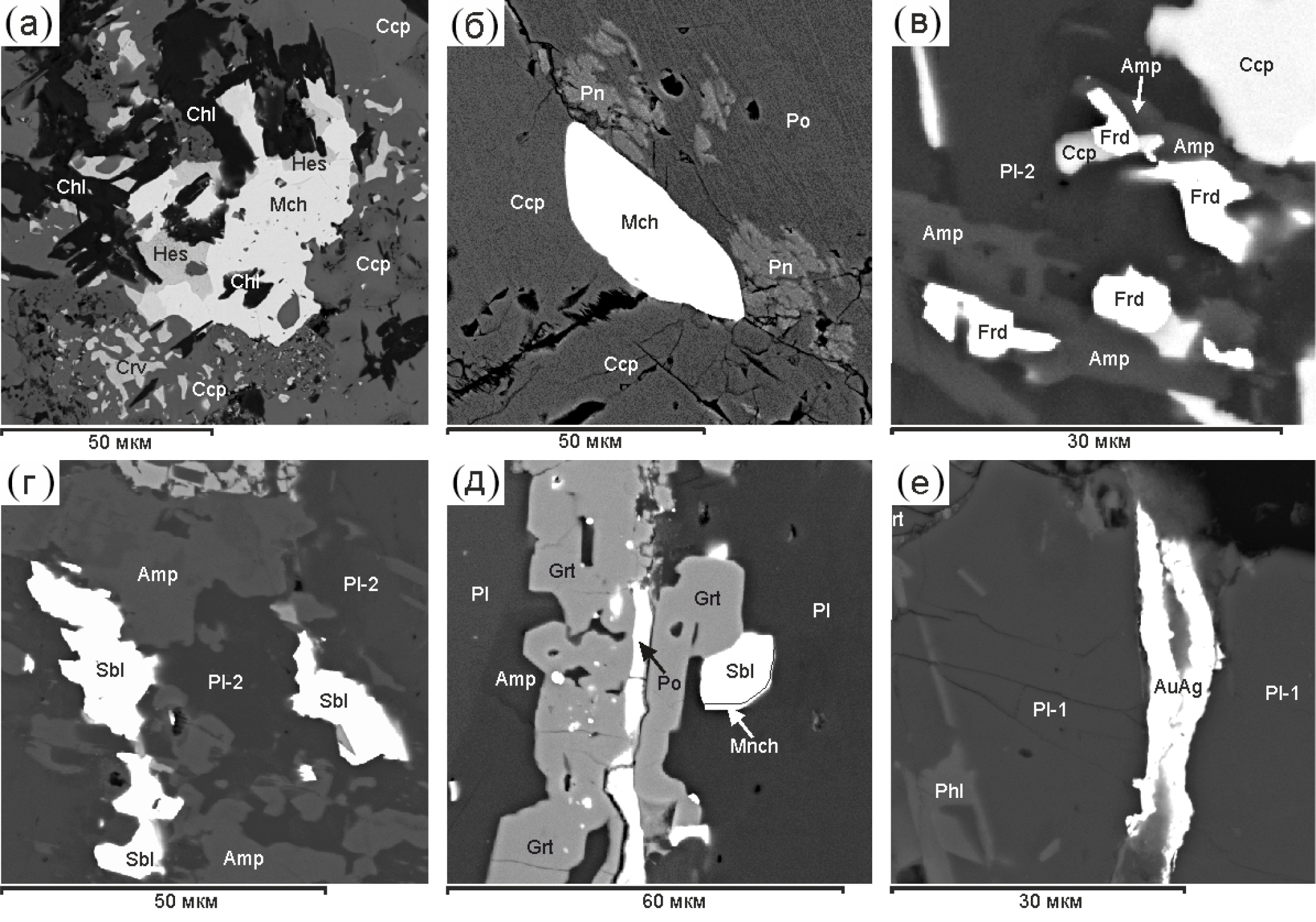 Фиг. 4. Взаимоотношения минералов в рудном пегматите. Электронный микроскоп, изображение в режиме обратно-рассеянных электронов (BSE). а – тонкие пластинки ортопироксена (Opx) в клинопироксене (Cpx), обр. 38-2; б – развитие актинолита (Akt) совместно с сульфидами по плоскостям спайности клинопироксена (Cpx); в – выделения плагиоклаза (Pl-1) с сульфидами в межзерновом пространстве кристаллов ортопироксена (Opx), в хлорит-карбонатных прожилках наблюдаются сульфиды; г – участок автометасоматического изменения, сложенный Pl-2, эпидотом (Ep) и кубанитом (Cbn), в раннем плагиоклазе (Pl-1); д – лейсты флогопита (Phl) в ассоциации с Pl-2, апатитом (Ap), пирротином (Po), пентландитом (Pn) и халькопиритом (Ccp); е – участок развития флогопита (Phl) и паргасита (Prg); ж – кайма паргасита (Prg) по границе между сульфидами и Pl-1; з – выделения граната (Grt) по краям кристалла Pl-1 на контакте с пирротином (Po) и пентландитом (Pn); и – кристалл апатита (Ap) c включениями альбита (Ab), магнезиотарамита (Mtm), халькопирита (Ccp) и каймой магнетита (Mag) на контакте с пирротином (Po). Символы минералов по (Whitney, Evans, 2010). а, б, в – обр. 38-2; г – обр. 38-5; д, и – обр. 38-13; е, ж, з – 38-7.